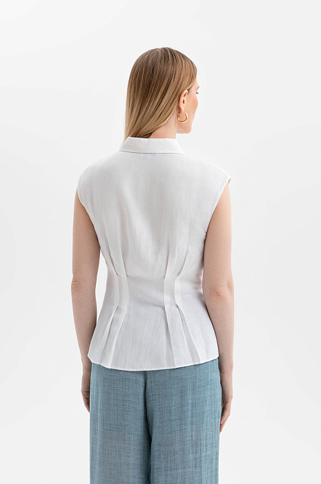Лёгкая, скульптурная и сдержанно эффектная белая блузка KANZLER без рукавов изо льна и вискозы — нарядная вещь для тёплых дней. Особенно изысканно она смотрится в дуэте со свободными брюками и струящимися юбками. Приталенный крой в сочетании с широкой, слегка структурированной драпировкой призван подчеркнуть женственность и нежность образа. Блузка выполнена из дышащей ткани, которая сочетает прочность и благородную фактуру натурального льна с мягкостью и пластичностью вискозных волокон. Такой материал отлично сохраняет форму и обеспечивает ощущение лёгкости и свежести в течение всего дня.