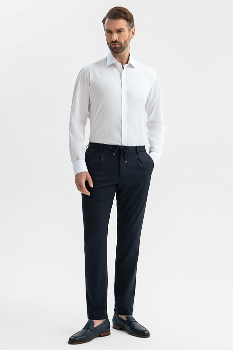 Брюки KANZLER глубокого темно-синего цвета слегка зауженного силуэта на кулиске — не слишком формальная, но при этом комфортная и элегантная одежда для офиса и свободного времени. Секрет популярности — в отсутствии стесняющего пояса. Вместо жестких ограничений — удобная кулиска, позволяющая регулировать степень прилегания, и вшитые по бокам резинки. Технологичная смесовая ткань с переплетением «елочка» состоит из трех видов современных волокон. Она хорошо держит форму, не мнется и легко адаптируется к индивидуальным особенностям фигуры. Параметры модели: рост 189, 102-80-99 Размер на модели: 50