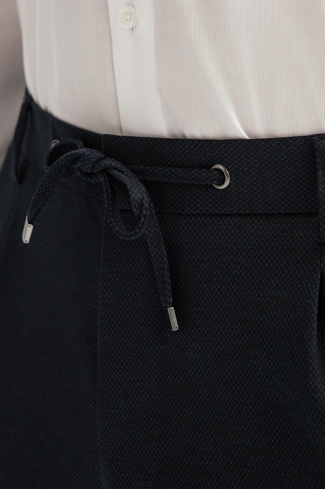 Синие брюки на кулиске из трикотажной ткани, цвет синий, цена 10 990 руб., код 269099 - купить в Перми в интернет-магазине KANZLER