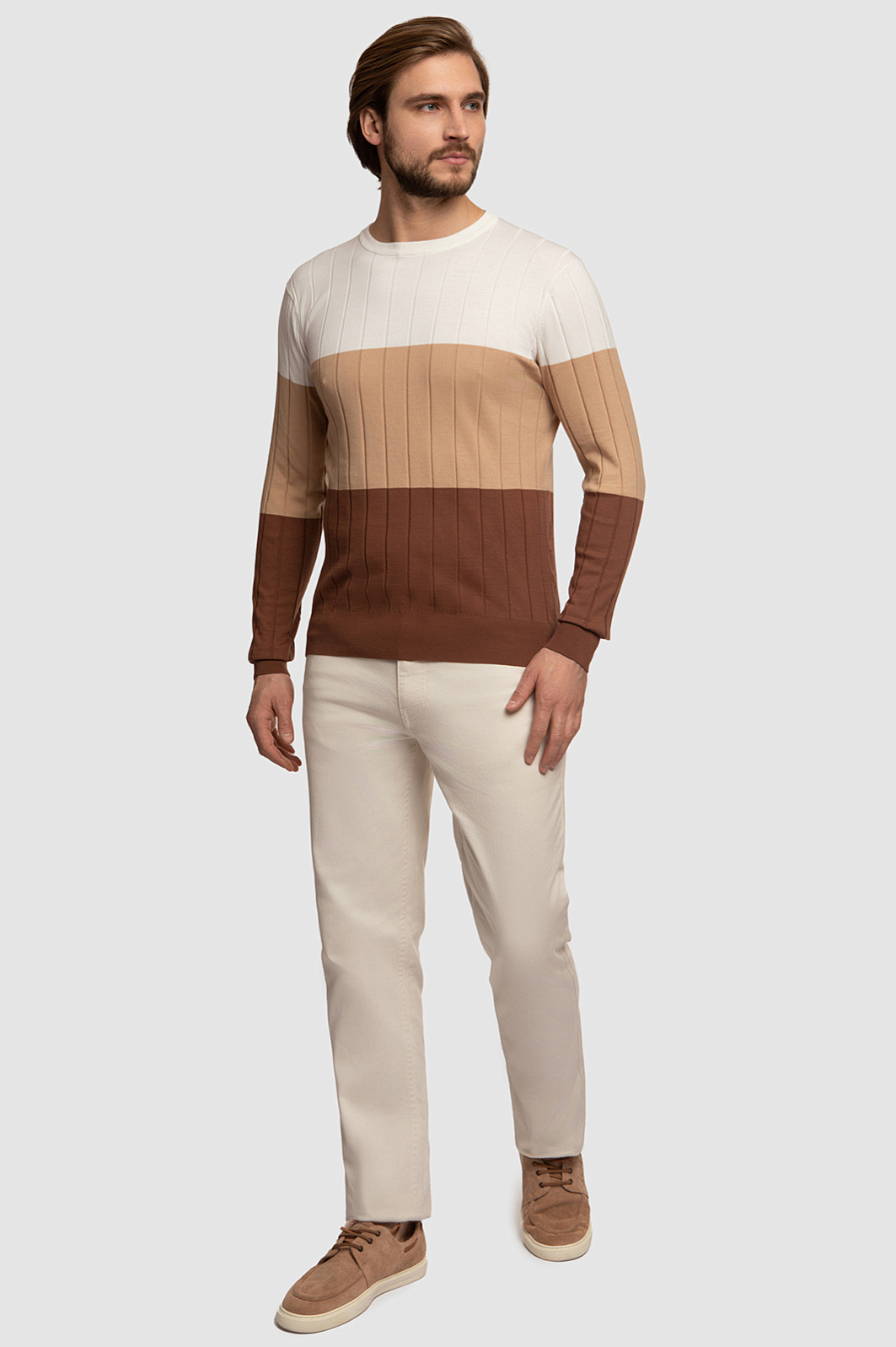 Джемпер KANZLER прямого кроя получился легким и приятным на ощупь, поэтому его комфортно носить в течение всего дня. Дизайн модели основан на принципе комбинирования цветовых блоков в одном изделии. Джемпер в широкую горизонтальную полоску — отличный вариант освежить и разнообразить повседневный и праздничный гардероб. Достаточно подобрать низ в молочных или коричневых оттенках, чтобы завершить образ. Модель c круглым воротом связали из мягкого хлопка Пима, который относится к премиальному сорту хлопка. Он обеспечивает эффектный внешний вид, невероятную мягкость, тонкость и воздушность фактуры. Гипоаллергенный материал прекрасно поддерживает оптимальную температуру и хорошо пропускает воздух. Параметры модели: рост 187, 100-81-97 Размер на модели: M