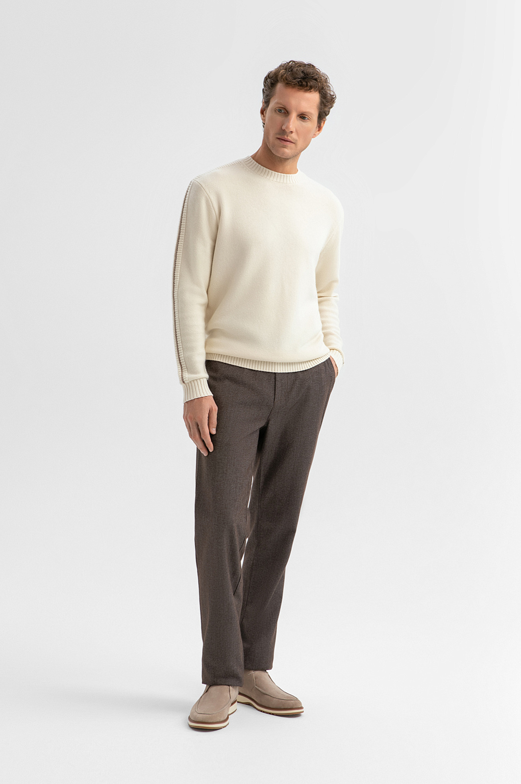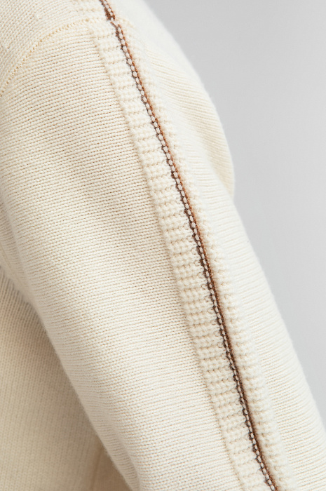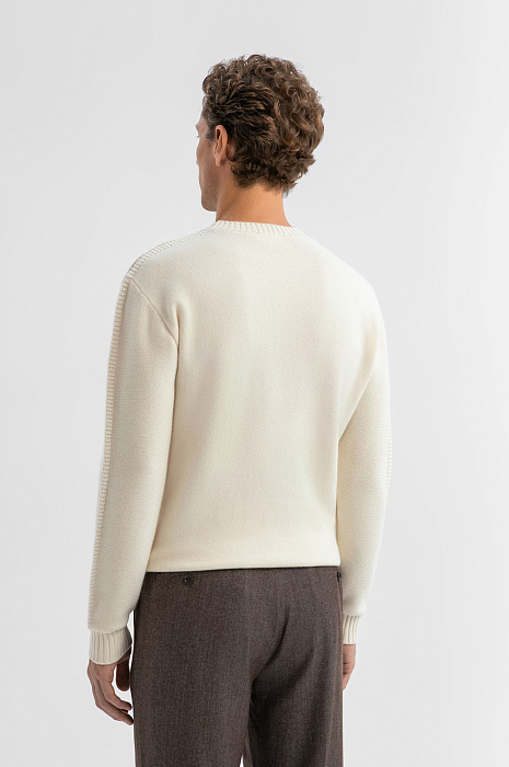 Светло-бежевый джемпер KANZLER из шерсти с кашемиром — воплощение сдержанной элегантности и комфорта. Модель легко сочетается с брюками, джинсами или классическим пальто и служит универсальным вариантом для повседневных и умеренно нарядных аутфитов. Гладкая вязка подчёркивает чистоту линий и минималистичный стиль. Фактурная полоска, дополненная тонкой коричневой линией, на рукавах — деликатный акцент, который придаёт модели индивидуальность. Плотный вязаный трикотаж выполнен из роскошной шерстяной пряжи с добавлением кашемира, которая приятно ощущается на теле, сохраняет тепло и позволяет коже дышать. Параметры модели: рост 188, 97-82-92 Размер на модели: M
