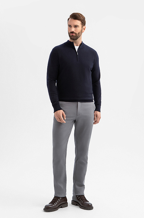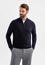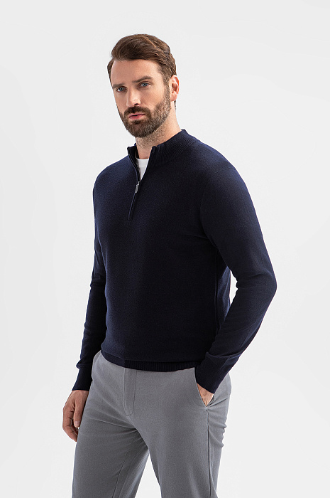 Джемпер KANZLER в глубоком темно-синем оттенке – сочетание натуральных материалов и продуманного дизайна. Состав – проверенная временем формула: шерстяные волокна (95%) обеспечивают идеальную терморегуляцию и сохраняют форму, а добавка кашемира (5%) придает материалу шелковистую фактуру и благородное сияние. Стильный воротник-стойка на молнии позволяет менять образ одним движением руки и регулировать комфортную температуру. Универсальный темно-синий оттенок – основа для множества образов – от деловых встреч до вечерних мероприятий. Модель подходит для создания многослойных сочетаний с футболкой. Параметры модели: рост 189, 102-80-99 Размер на модели: M