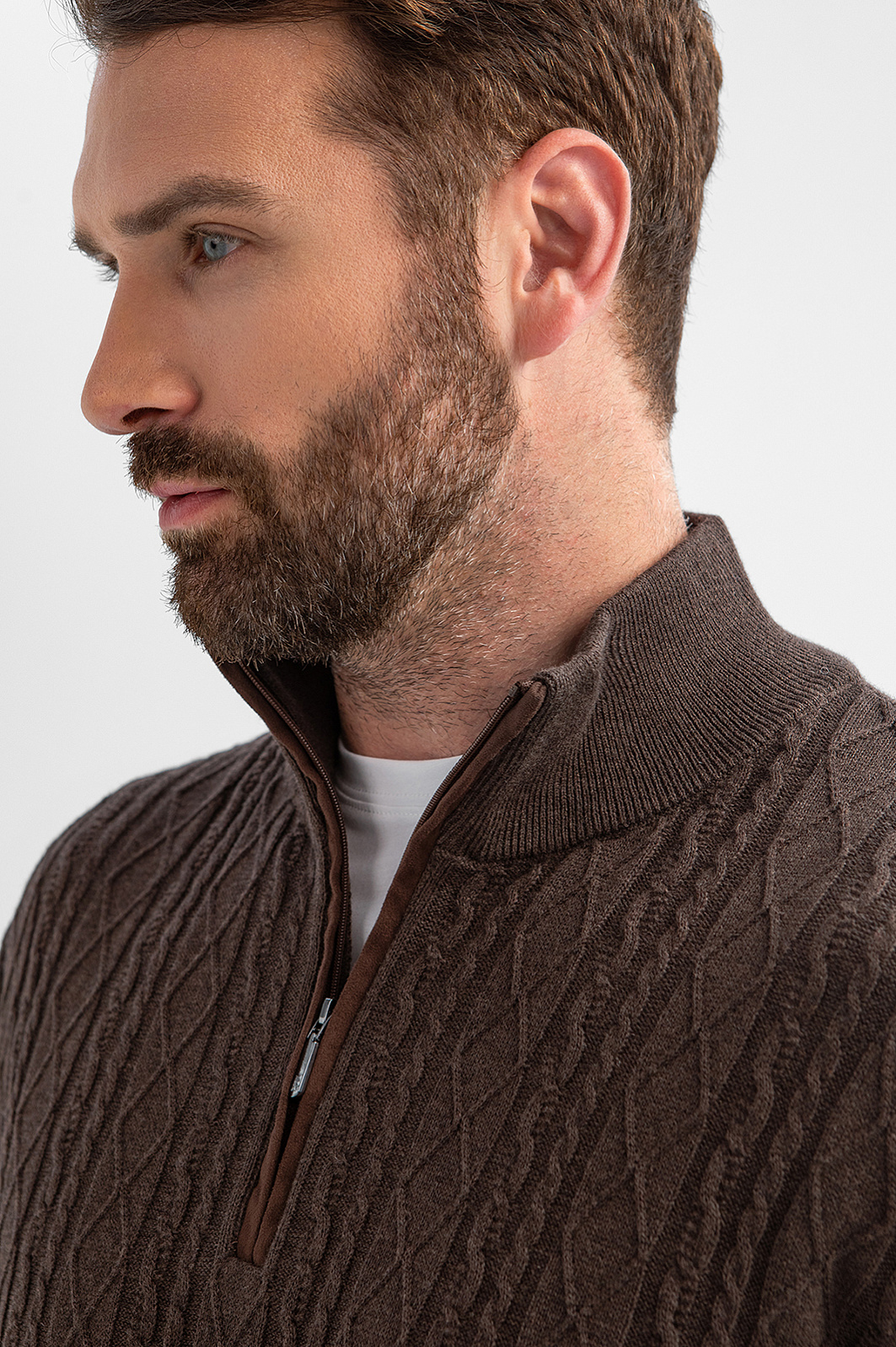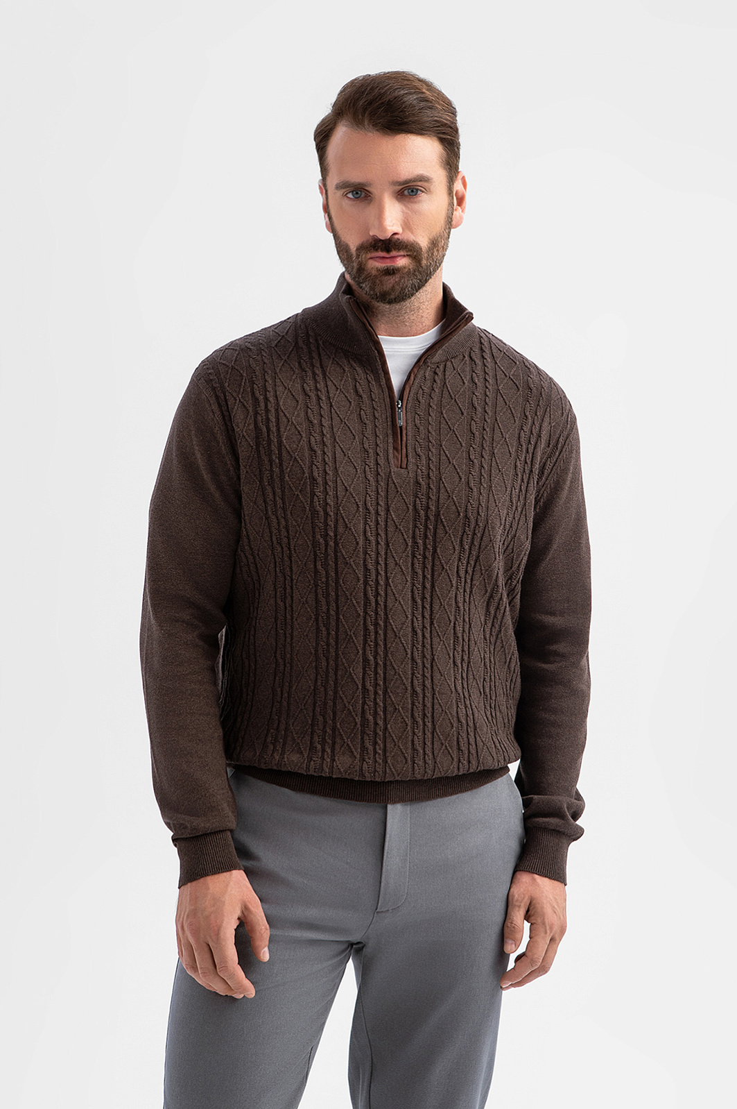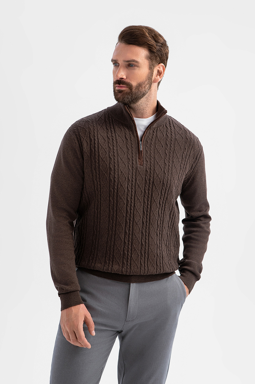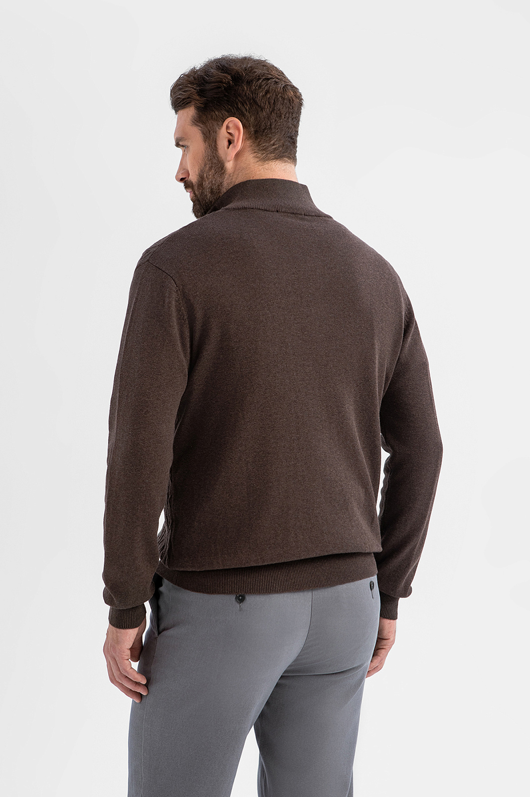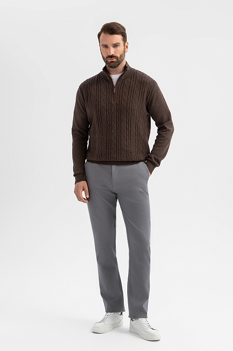 Джемпер KANZLER глубокого коричневого оттенка из хлопка и кашемира создан для тех, кто ценит красоту повседневных вещей. Передняя часть украшена фактурной вязкой с рельефными косами и ромбами — выразительный акцент, напоминающий о традициях ручной работы. Гладкая спинка «успокаивает» декоративную часть, сохраняя силуэт лаконичным и современным. Мягкий воротник-стойка на молнии позволяет застёгивать его для тепла или приоткрывать для непринуждённого образа. Трикотажные резинки поддерживают края джемпера, обеспечивая аккуратную посадку. Натуральные гипоаллергенные волокна в составе обеспечивают лёгкость и комфорт. Хлопок сохраняет свежесть, кашемир дарит естественное тепло. Параметры модели: рост 189, 102-80-99 Размер на модели: M