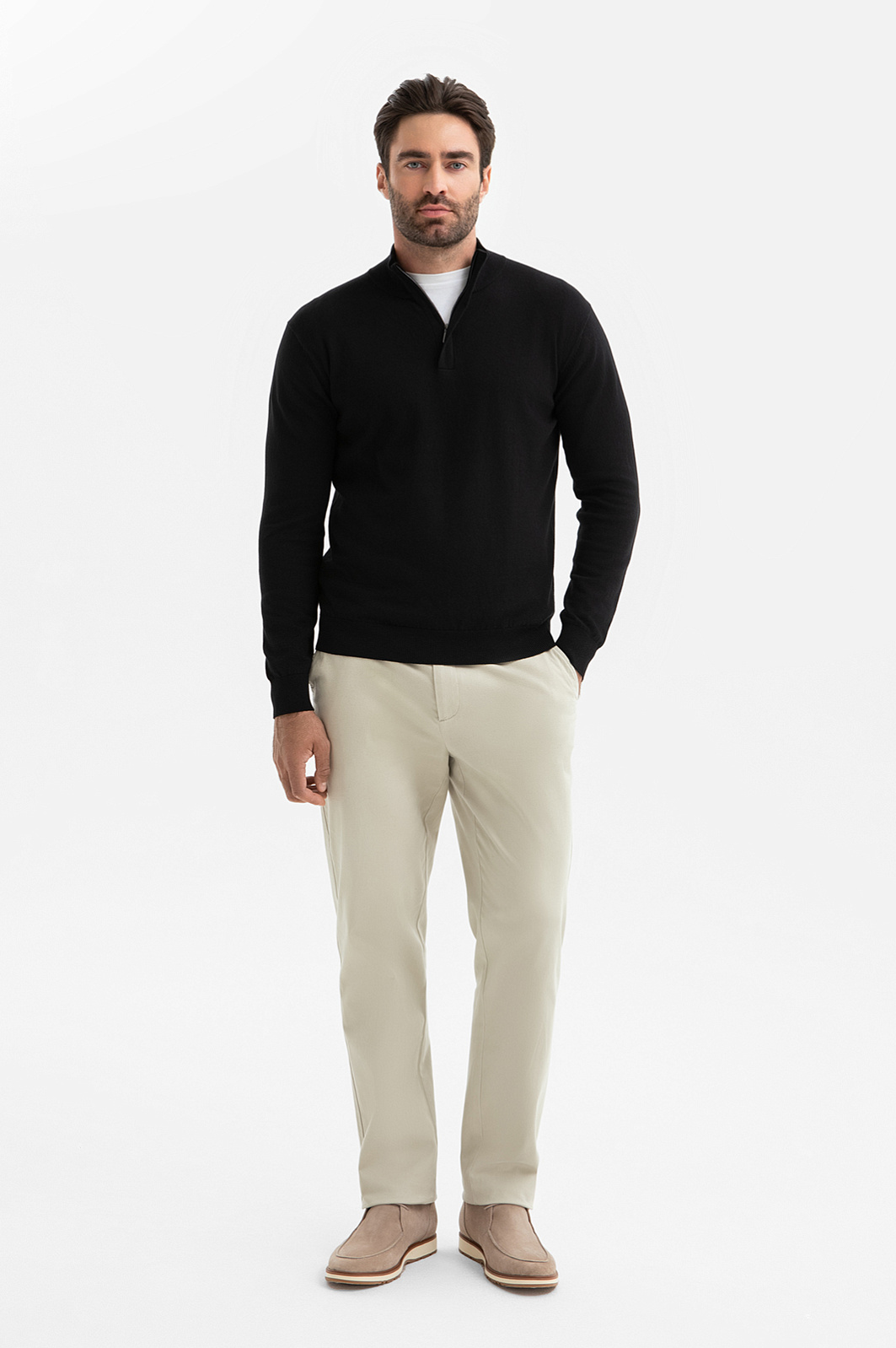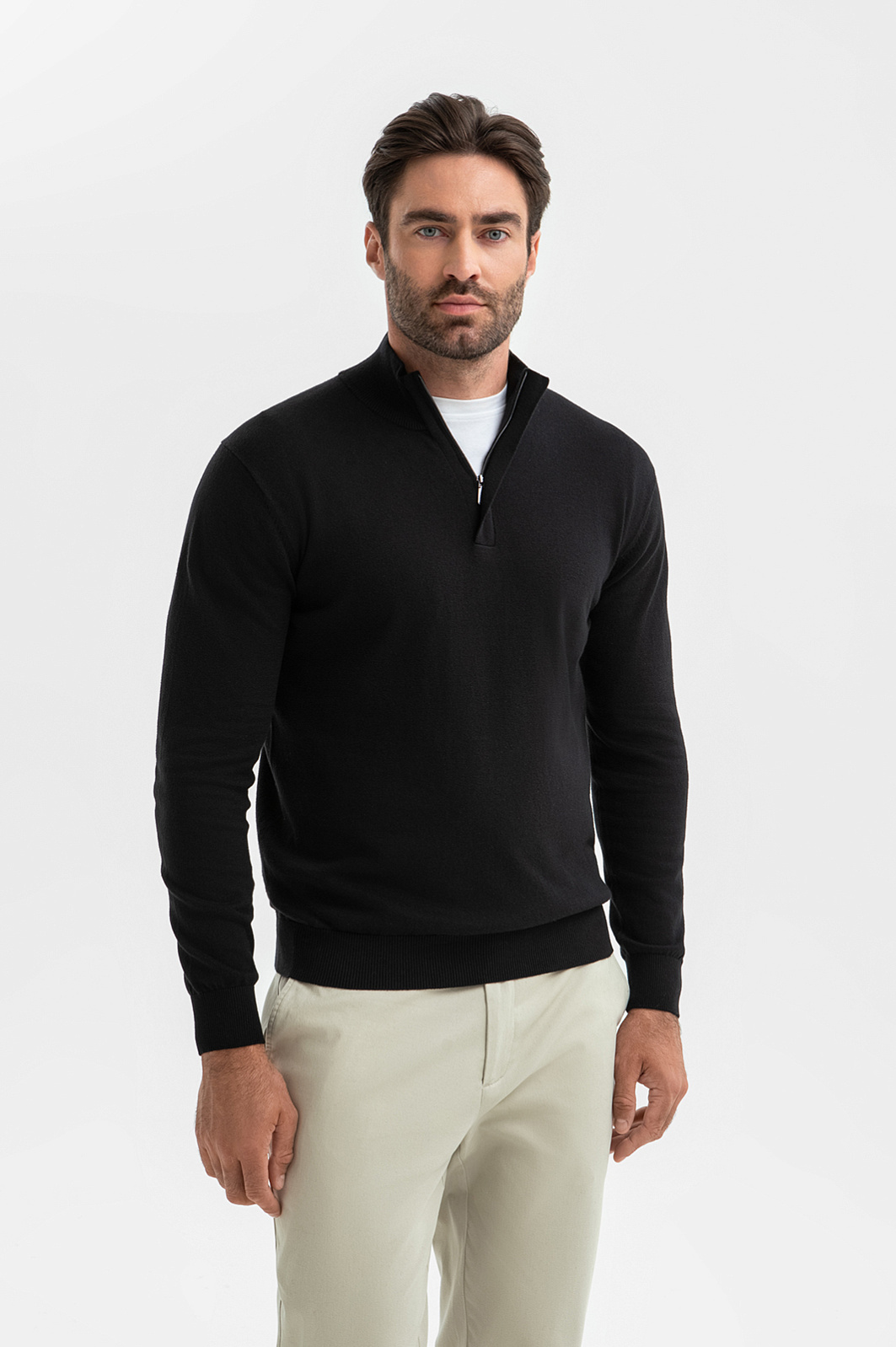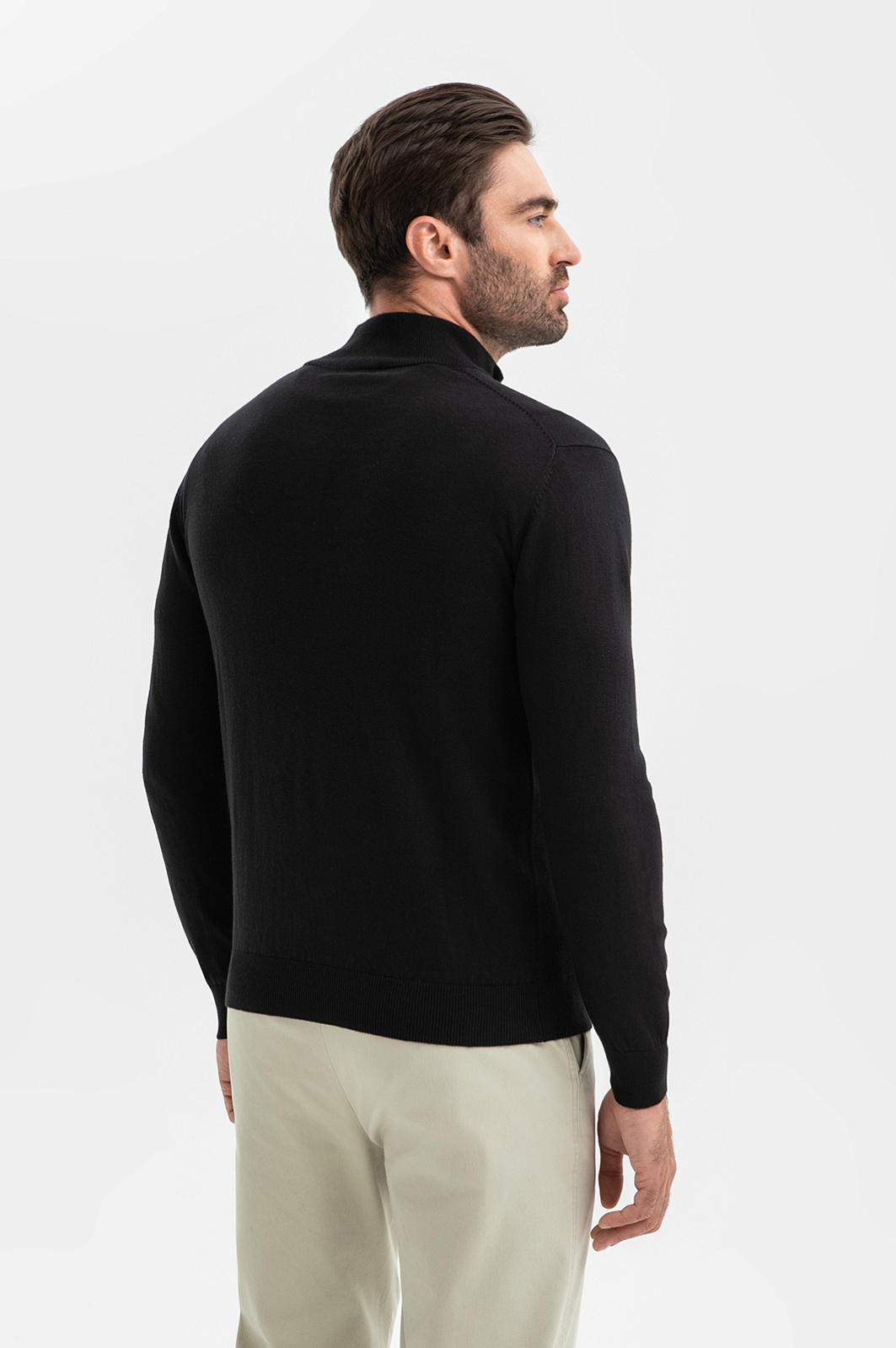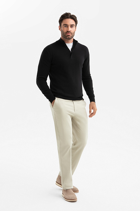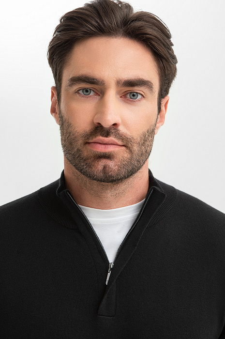 Черный джемпер KANZLER из хлопка и кашемира идеален для создания образов, где власть принадлежит не громким деталям, а безупречному крою и чистым линиям. Мягкий воротник-стойка на молнии, скрытой планкой, позволяет трансформировать образ и регулировать комфортную температуру. Состав материала – формула абсолютного комфорта: гипоаллергенный хлопок дарит мягкость и бережен даже к чувствительной коже, а волокна кашемира обеспечивают ощущение нежности и идеальную терморегуляцию. Глубокий черный цвет – универсальная база, которая подчеркивает статусность и позволяет создавать множество сочетаний. Параметры модели: рост 192, 108-83-102 Размер на модели: M