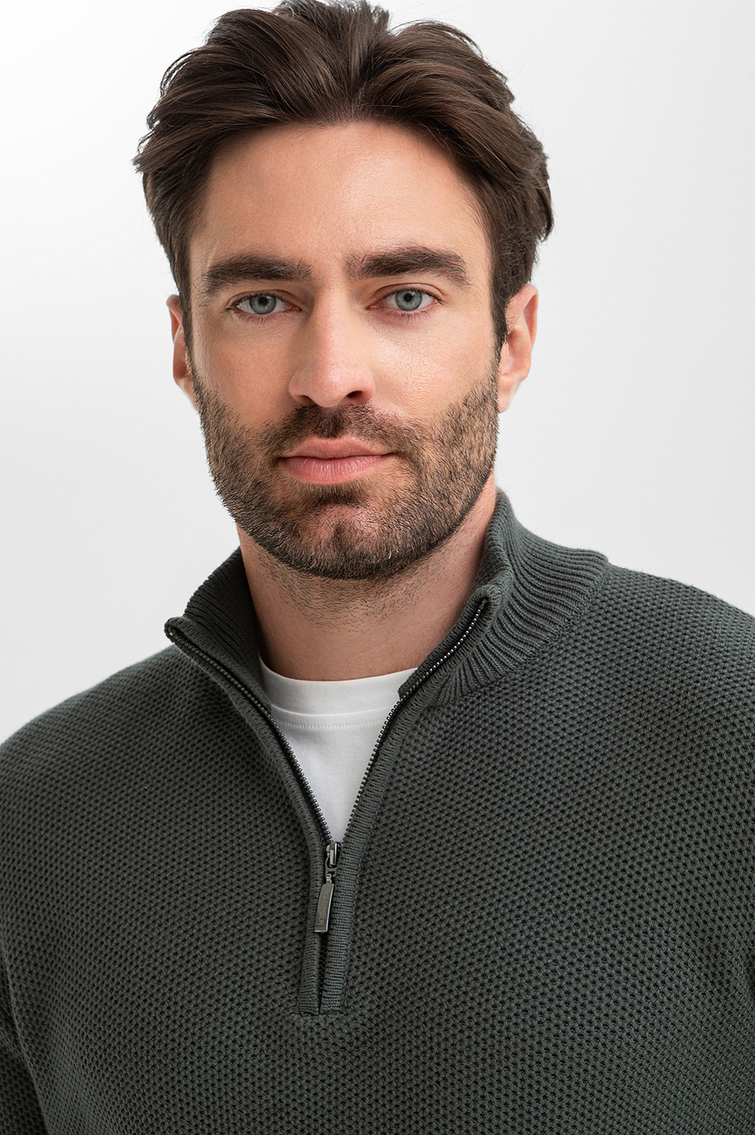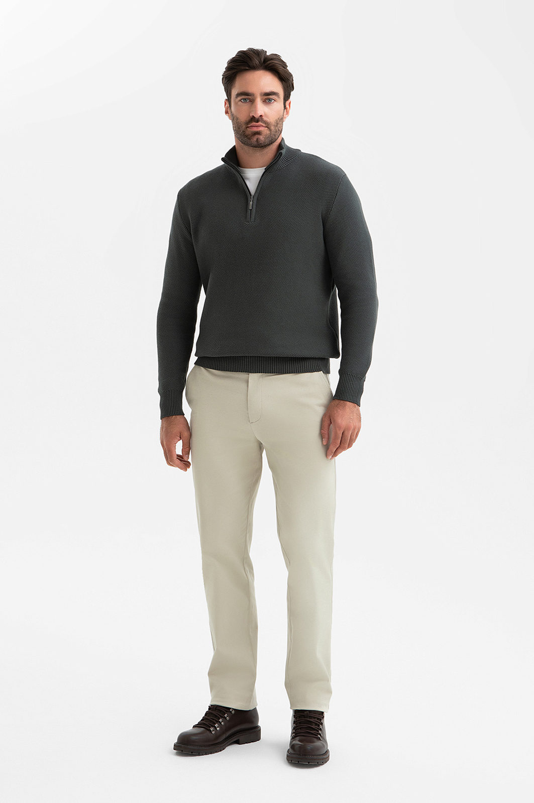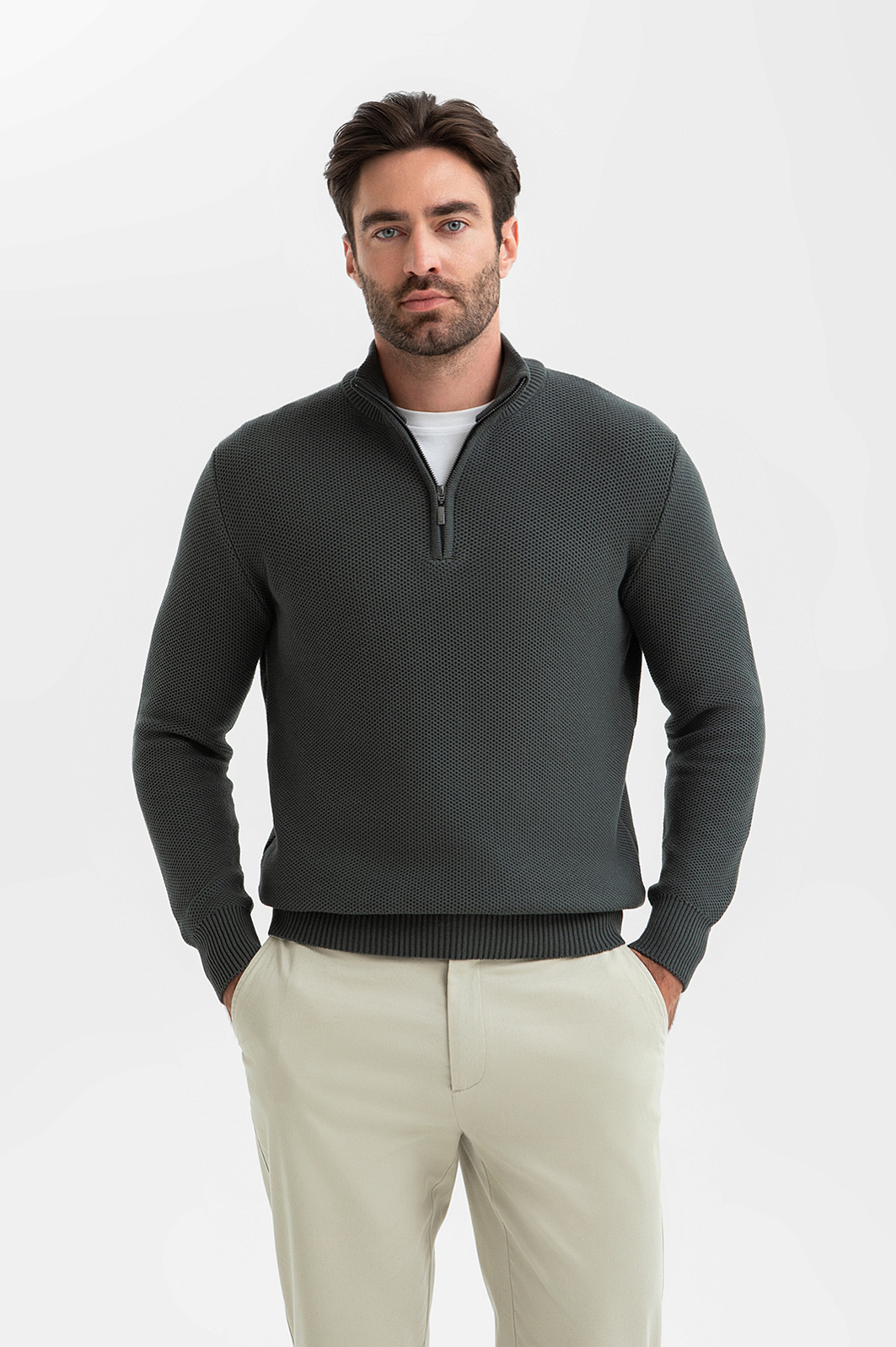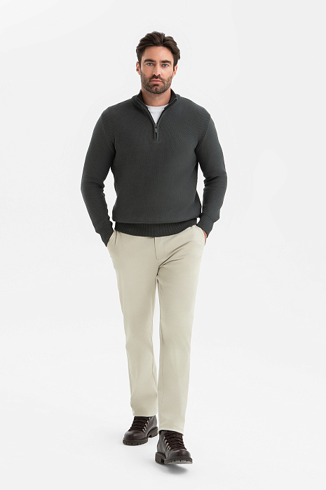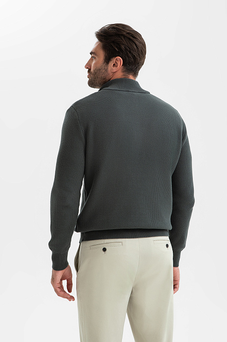 Серо-зеленый джемпер KANZLER легко переходит из деловой обстановки в повседневную жизнь, подчеркивая безупречный стиль своего обладателя. Для его создания выбрали 100-процентный хлопок – мягкий дышащий материал премиального качества. Воротник-стойка на молнии позволяет одним движением руки менять образ и регулировать комфортную температуру, защищая шею от ветра в прохладный день. Эластичная резинка на манжетах и по низу изделия служит аккуратной посадке. Параметры модели: рост 192, 108-83-102 Размер на модели: M