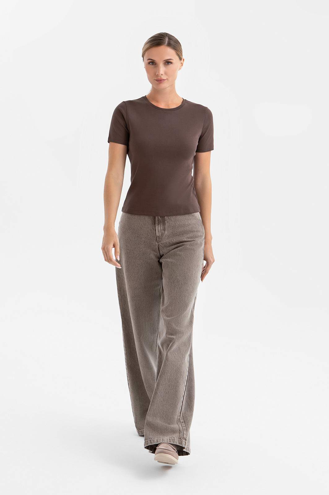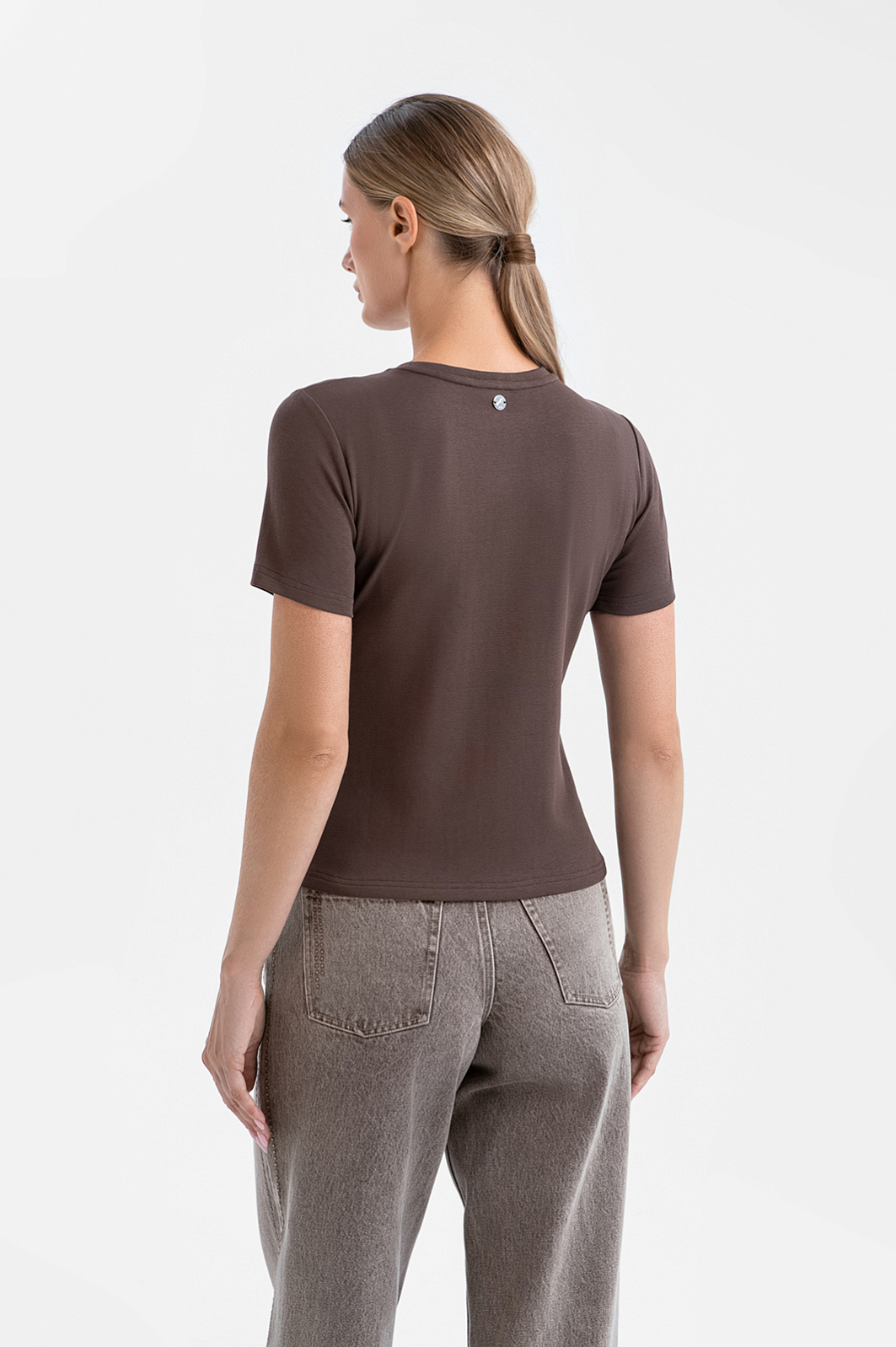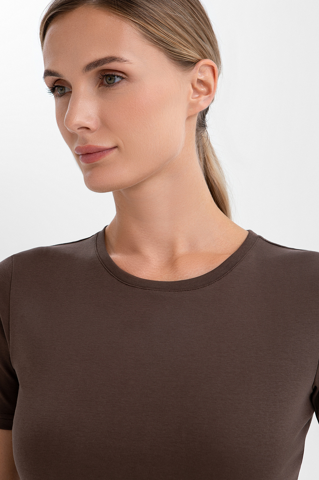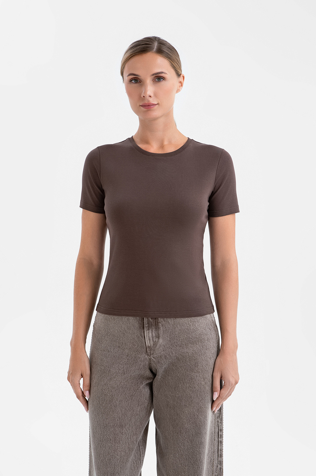 Стильная футболка KANZLER шоколадного оттенка прилегающего силуэта с аккуратным круглым вырезом из чистого хлопка — союз минимализма и удобного спортивного стиля. Она вписывается в повседневный гардероб и гармонично сочетается с расслабленными джинсами и юбками. Крой мягко подчёркивает женственные линии тела. Неброская деталь на спинке — фирменный шильдик — добавляет модели индивидуальность. Гладкий эластичный трикотаж сделан из 100% гипоаллергенного хлопка, который дарит ощущение лёгкости, свежести и свободы, позволяя коже дышать.