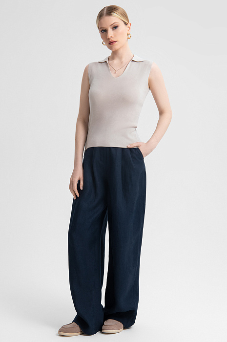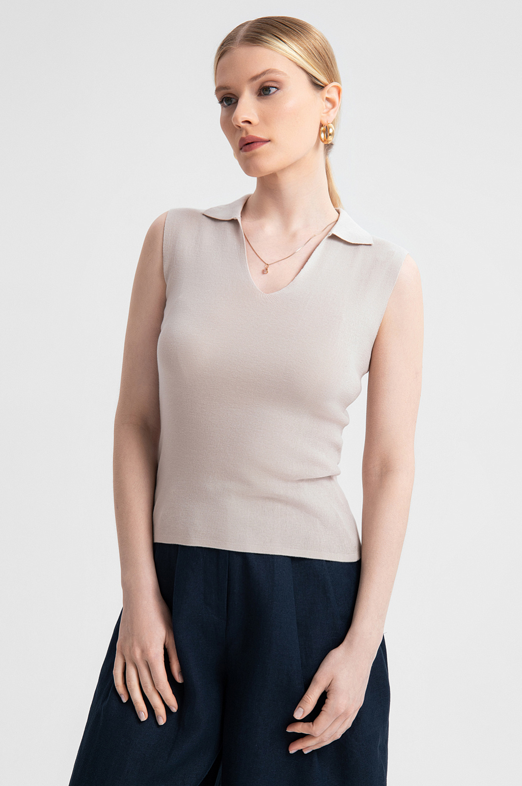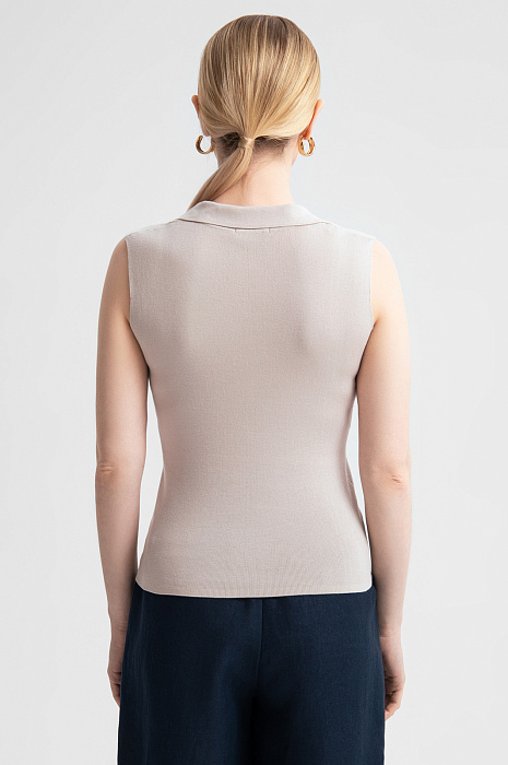 Поло из 100% хлопка призвано подчеркнуть вашу индивидуальность и добавить в образ легкости. Нежный серо-бежевый цвет встраивается в любой гардероб, открывая множество возможностей для стилизации. Материал из 100% натурального хлопка отличается мягкостью, воздухопроницаемостью и долговечностью. Его гипоаллергенные волокна подходят даже самой чувствительной коже. Крой без рукавов и треугольный вырез с отложным воротником добавляют изысканности и подчеркивают линию шеи и плеч. Легкая и изящная модель подходит для офиса, городской прогулки или свидания. Комбинируйте топ с различными элементами гардероба — брюками, юбками или шортами — и создавайте уникальные образы на каждый день. Параметры модели: рост 175, 88-65-92 Размер на модели: S