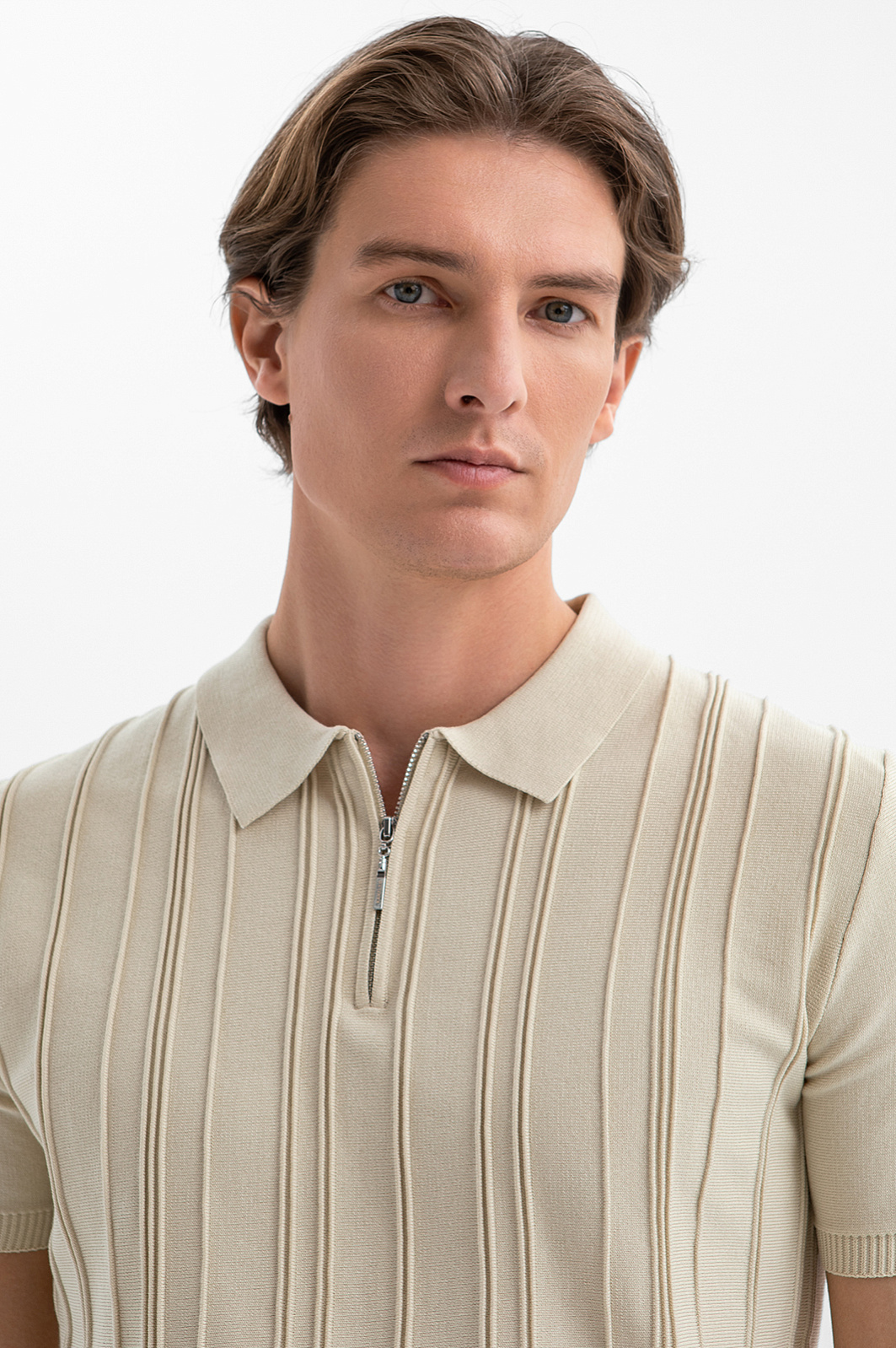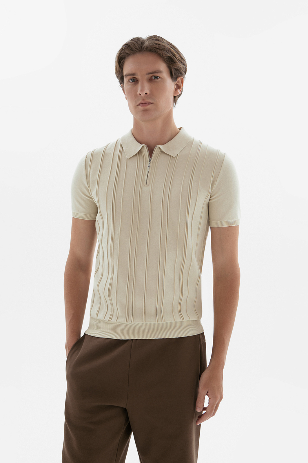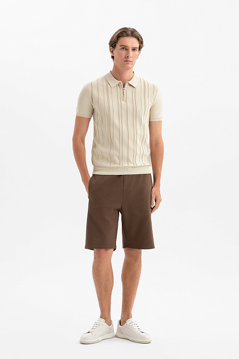 Поло KANZLER светло-бежевого оттенка из чистого хлопка — воплощение спокойного интеллектуального шика и элегантности. Такая модель легко сочетается с остальной частью гардероба, создавая как нарядные, так и повседневные образы. Нейтральный оттенок привлекает внимание к фактуре и деталям. Вертикальная рельефная полоска спереди формирует чёткий ритм и визуально вытягивает силуэт. Отложной воротник, застёжка-молния и короткий рукав напоминают о спортивном характере вещи. Качественный натуральный трикотаж превосходно сохраняет форму и выглядит статусно даже в простых сочетаниях. Дышащий гипоаллергенный хлопок обеспечивает комфорт в течение дня.