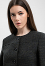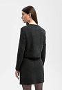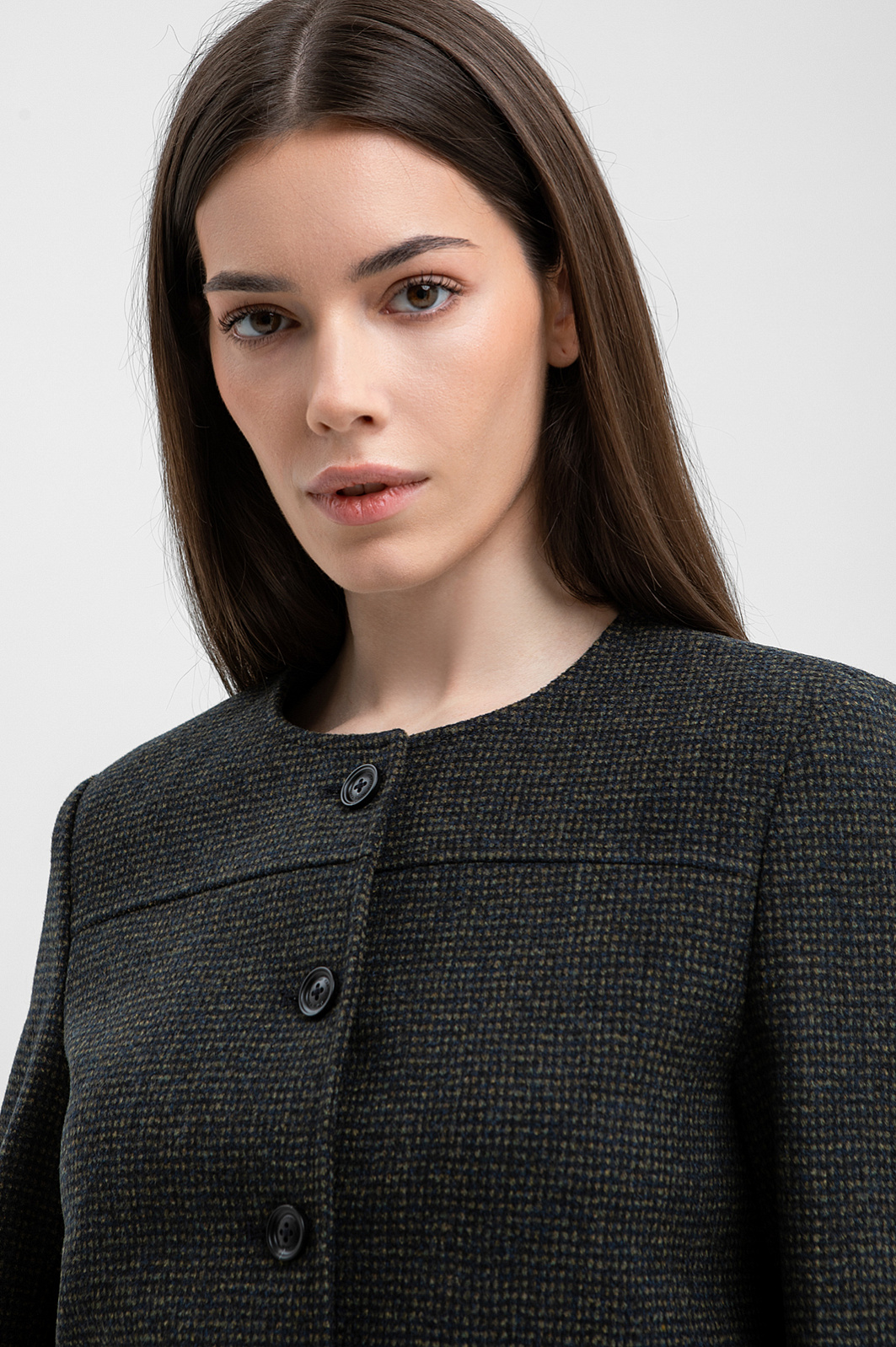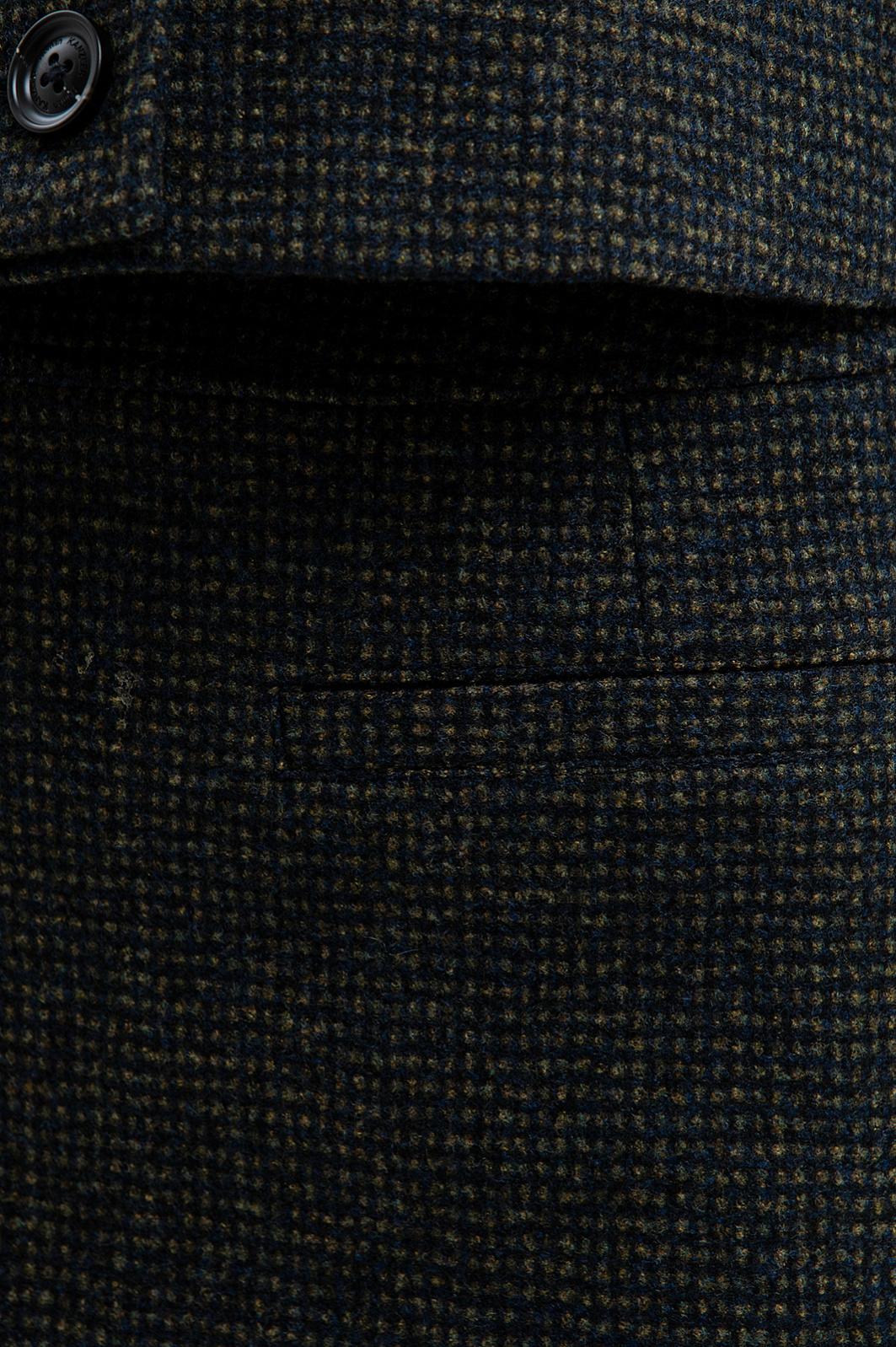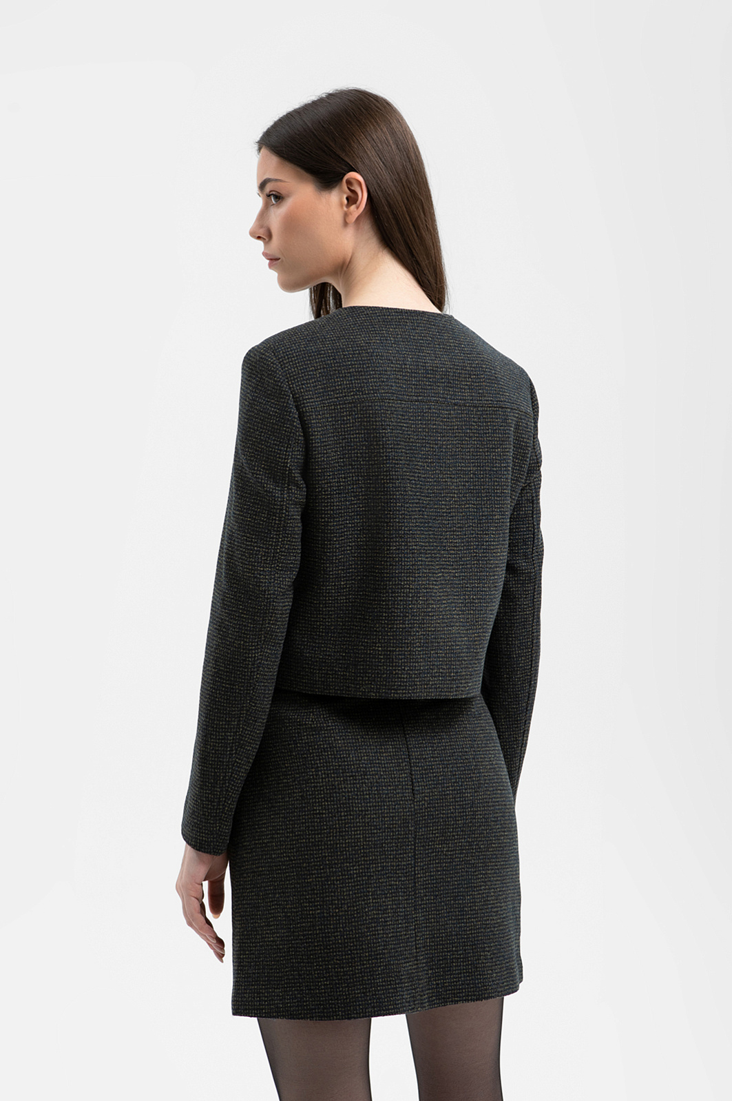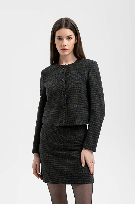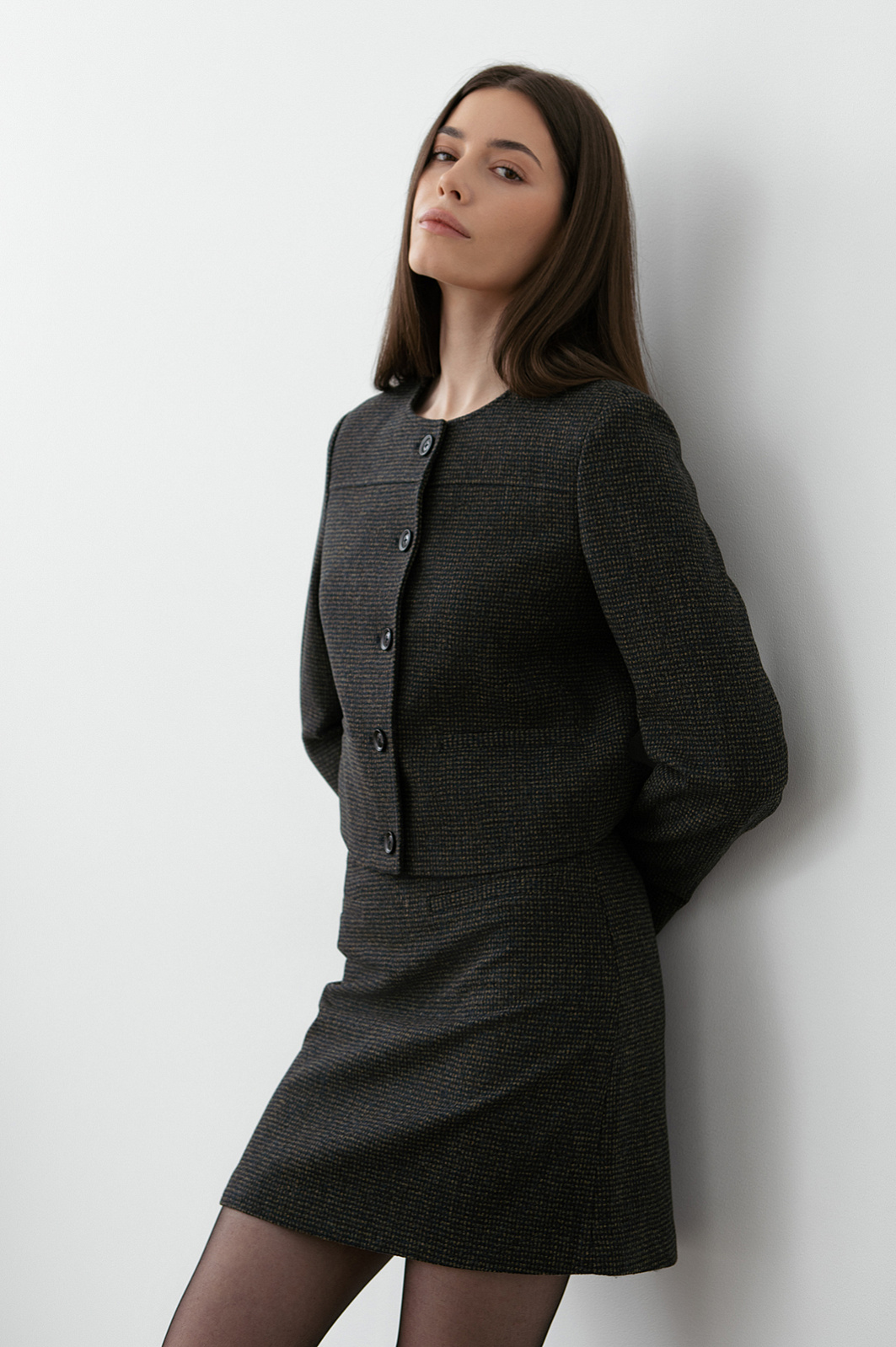 Стильный костюм KANZLER глубокого коричнево-зелёного оттенка в микроклетку — это гармоничное сочетание строгости и лёгкой провокативности. Укороченный жакет с неглубоким полукруглым вырезом горловины создаёт элегантный и женственный силуэт с акцентом на линию талии. Прямая планка спереди, ряд крупных пуговиц и аккуратные карманы в рамке задают облику строгость и структурность. Слегка расклешённая юбка длиной до середины бедра добавляет костюму нотку игривости. Состав ткани — бленд шерсти и современных волокон — обеспечивает комфорт и износоустойчивость. Натуральная шерсть (82%) дарит тепло, «дышит» и сохраняет форму, полиэстер делает ткань прочнее, а эластан помогает ей адаптироваться к индивидуальным особенностям фигуры.