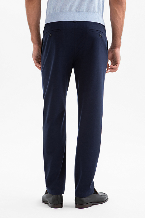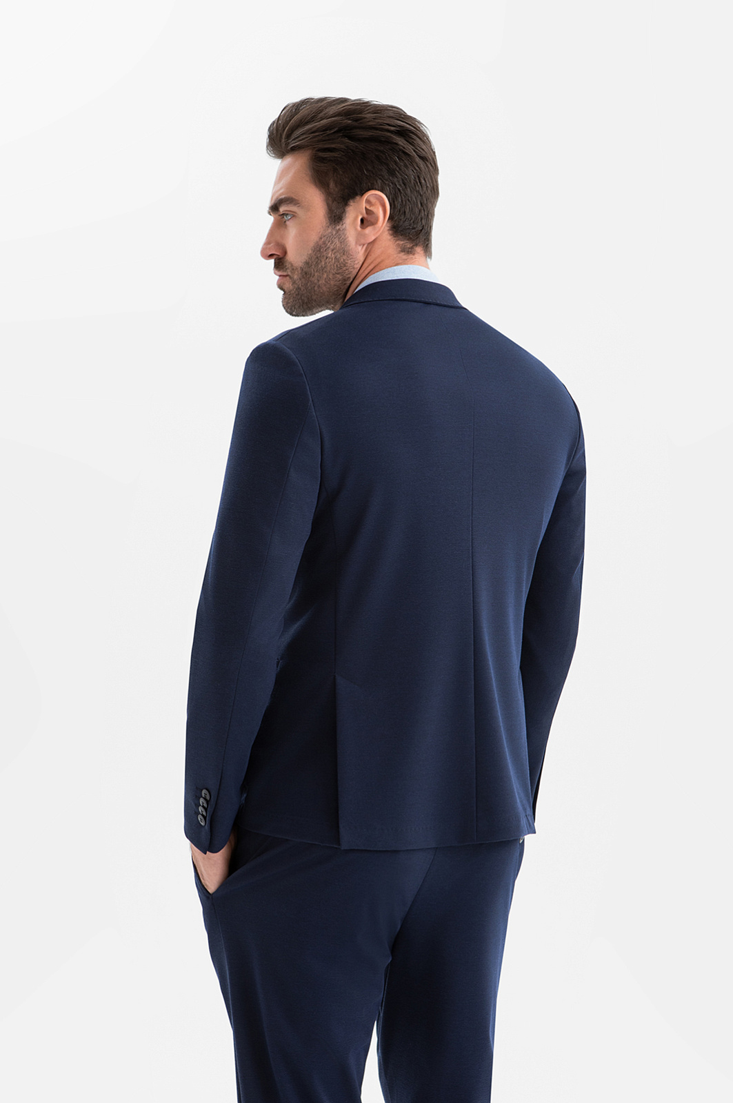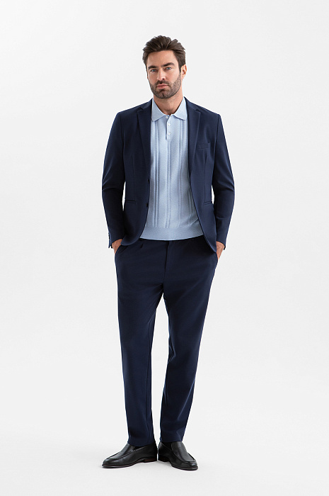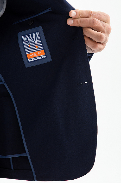 Синий костюм KANZLER зауженного силуэта — воплощение современного делового стиля, союз элегантности и продуманного комфорта. Комплект включает лёгкий однобортный пиджак с прорезными карманами и брюки на кулиске с деликатными защипами на поясе. Элементы пары отличает слегка зауженный крой, который подчёркивает мужественный силуэт и придаёт образу элегантность. Практичная ткань не требует специального ухода. В составе — прочные полиэстер и нейлон с добавлением дышащей вискозы и эластичного спандекса. Технологичный смесовый материал хорошо держит форму и легко адаптируется к индивидуальным особенностям фигуры.