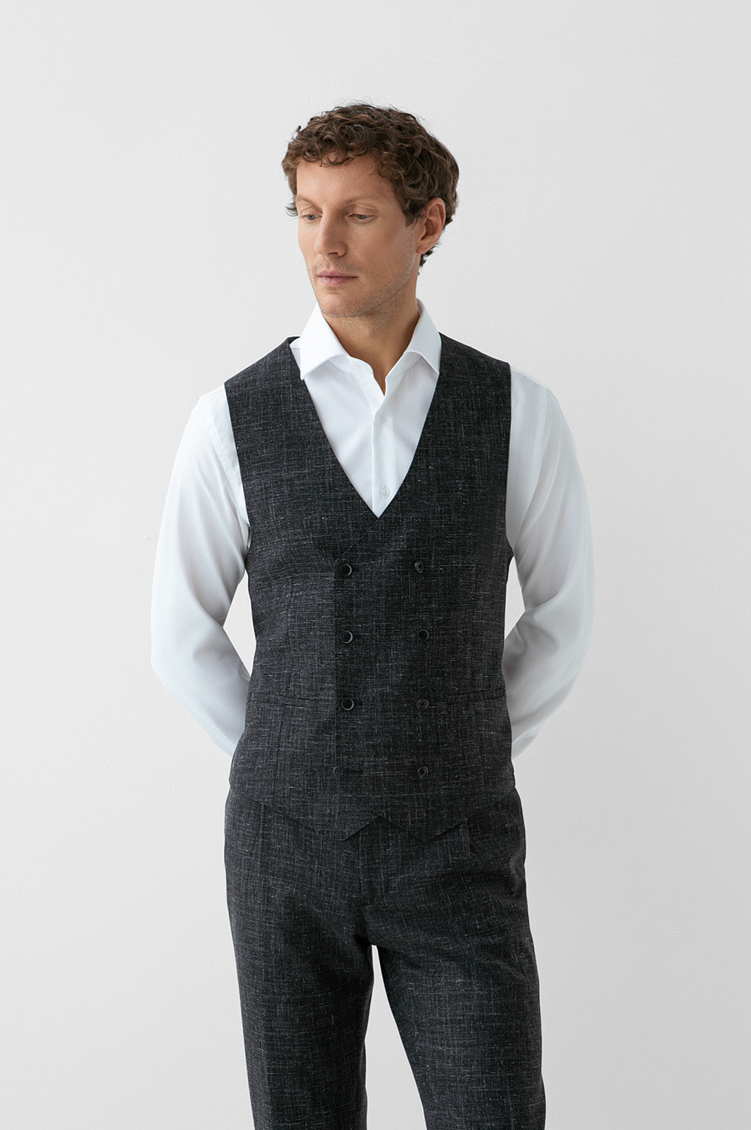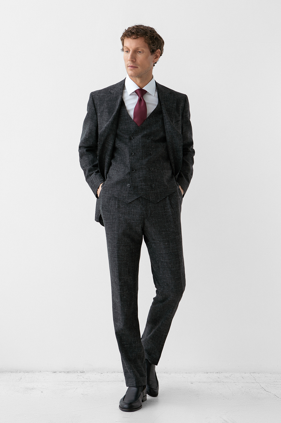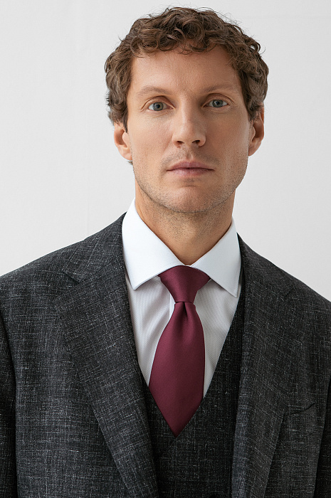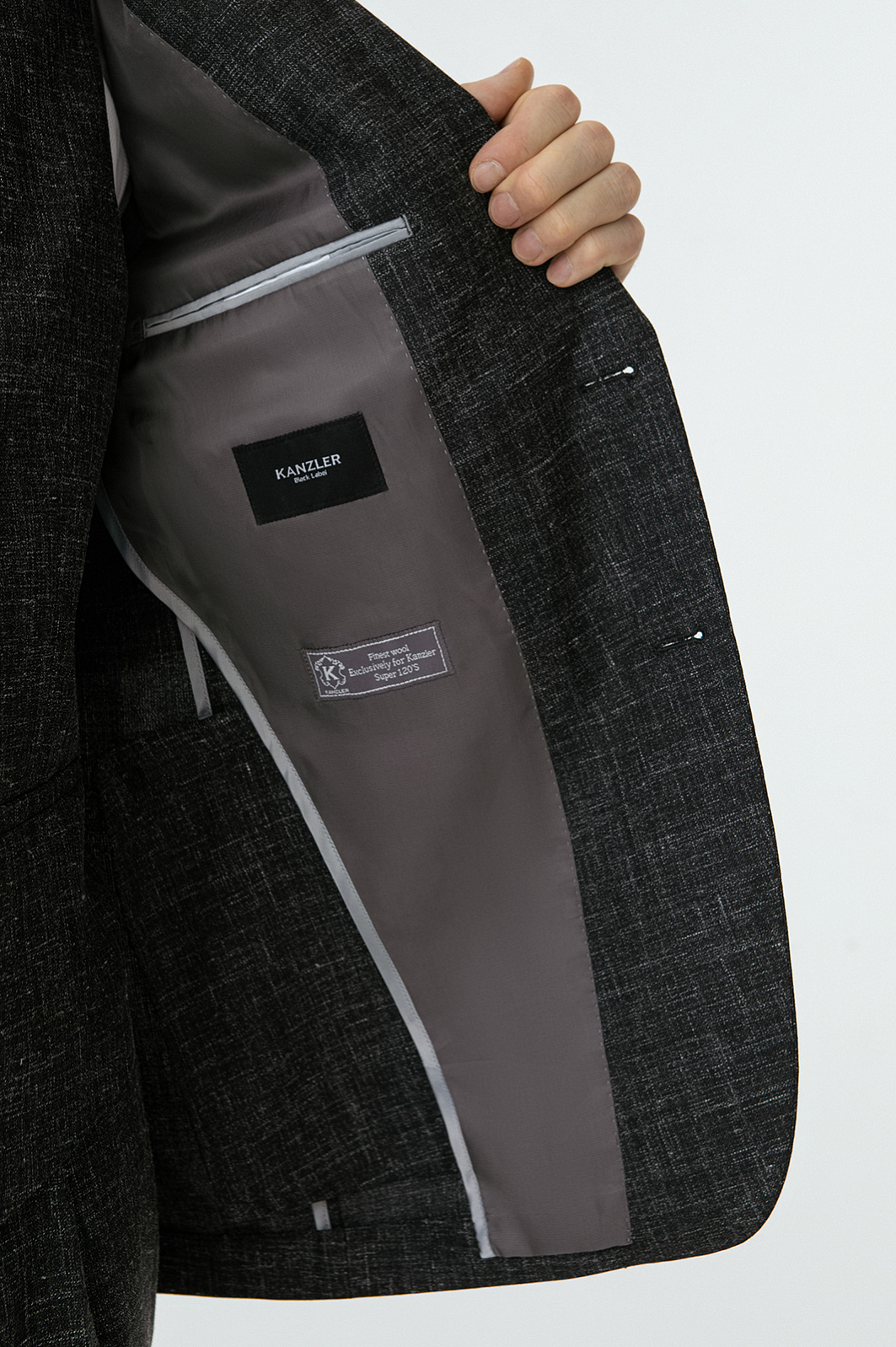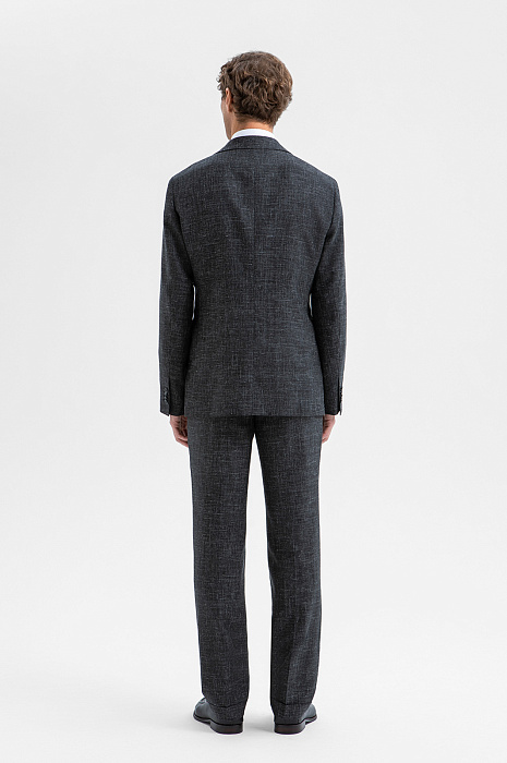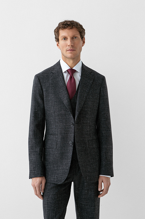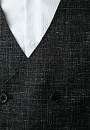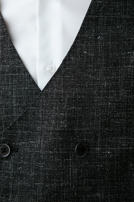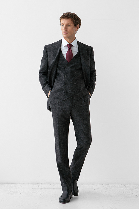 Роскошный чёрный костюм KANZLER из шерсти, льна и шёлка — интерпретация классики, которая является источником вдохновения и отправной точкой для создания современных деловых образов. Главное отличие модели — жилет, который превращает союз брюк с пиджаком в костюм-тройку. Многослойное сочетание сохраняет изящество благодаря слегка зауженному крою всех элементов и облегчённой конструкции пиджака. Меланжевый эффект смягчает категоричность чёрного и делает образ менее формальным. Дорогая натуральная ткань создана из шерсти мериноса с добавлением льна и шёлка. Тонкое волокно мериноса поддерживает форму и бережёт естественное тепло тела. Лён придает полотну структурность, шёлк — нежность и благородный лоск.