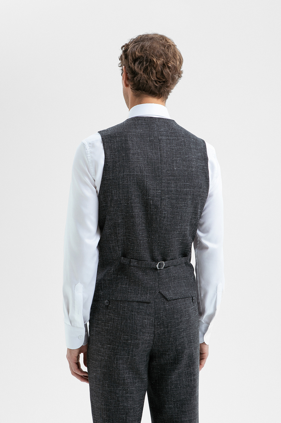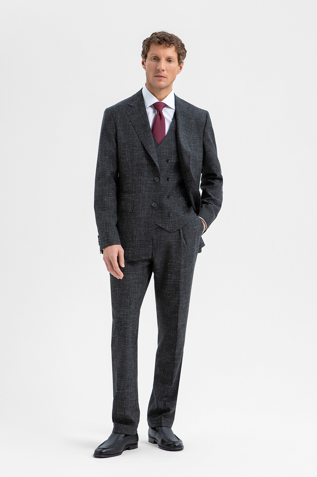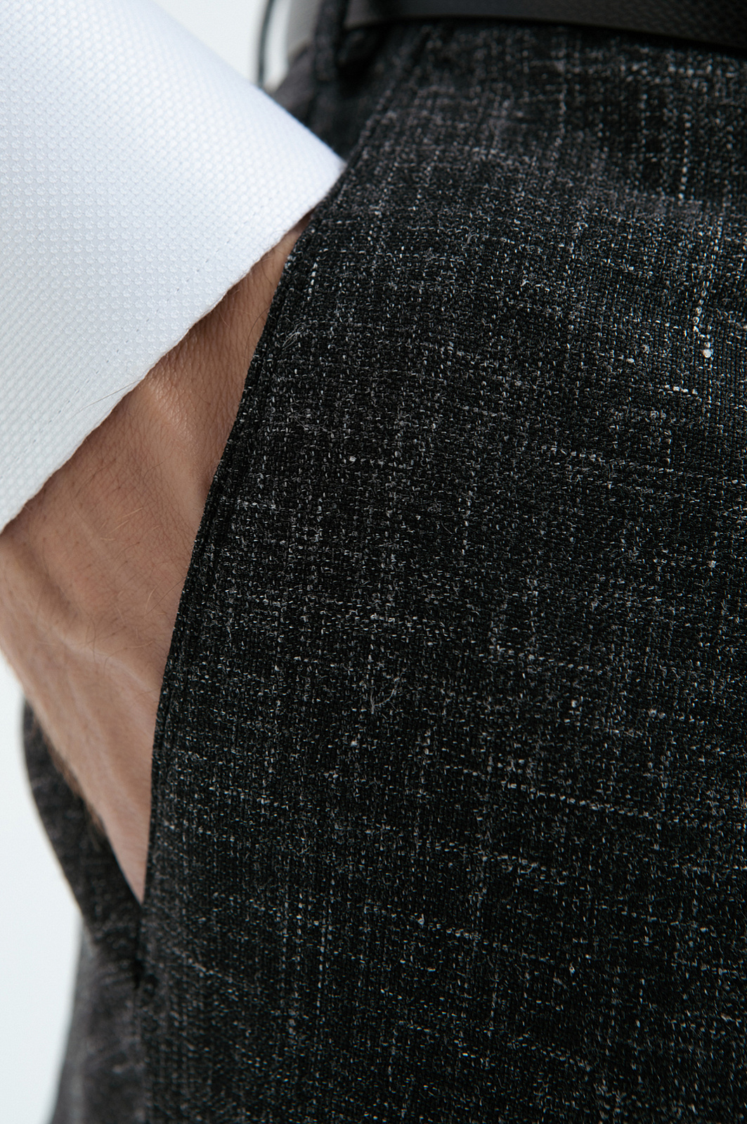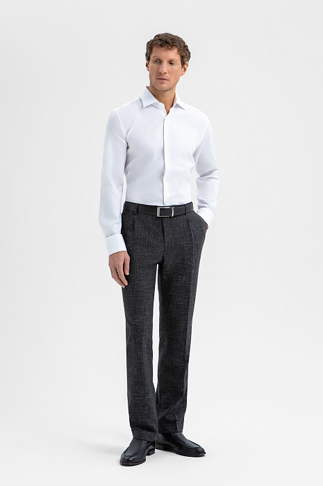 Роскошный чёрный костюм KANZLER из шерсти, льна и шёлка — интерпретация классики, которая является источником вдохновения и отправной точкой для создания современных деловых образов. Главное отличие модели — жилет, который превращает союз брюк с пиджаком в костюм-тройку. Многослойное сочетание сохраняет изящество благодаря слегка зауженному крою всех элементов и облегчённой конструкции пиджака. Меланжевый эффект смягчает категоричность чёрного и делает образ менее формальным. Дорогая натуральная ткань создана из шерсти мериноса с добавлением льна и шёлка. Тонкое волокно мериноса поддерживает форму и бережёт естественное тепло тела. Лён придает полотну структурность, шёлк — нежность и благородный лоск.