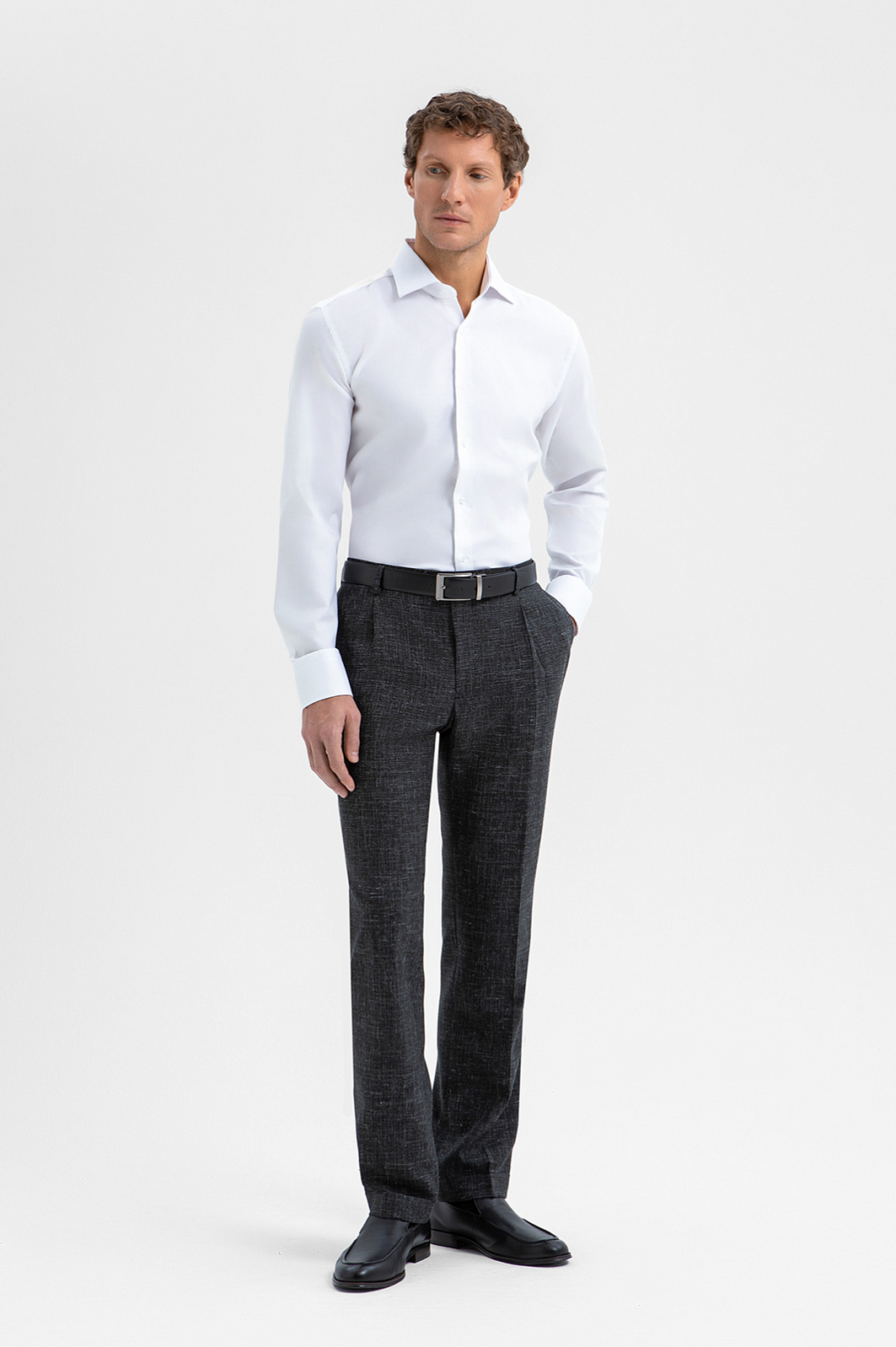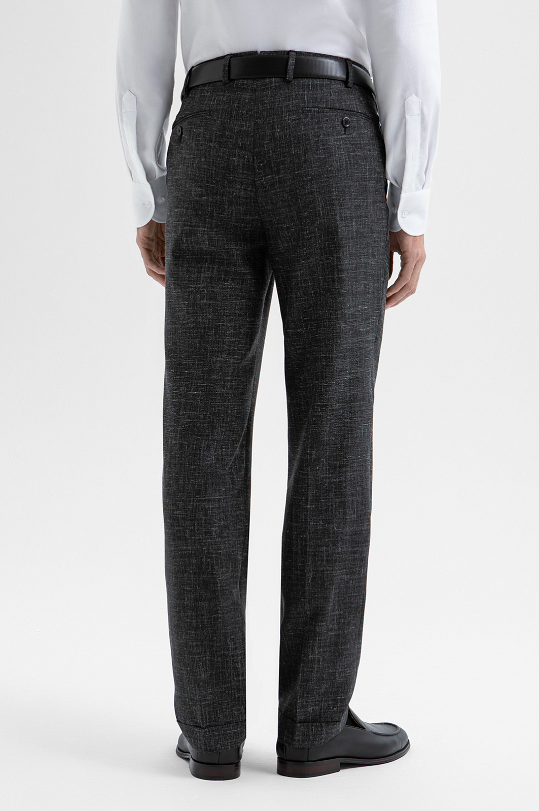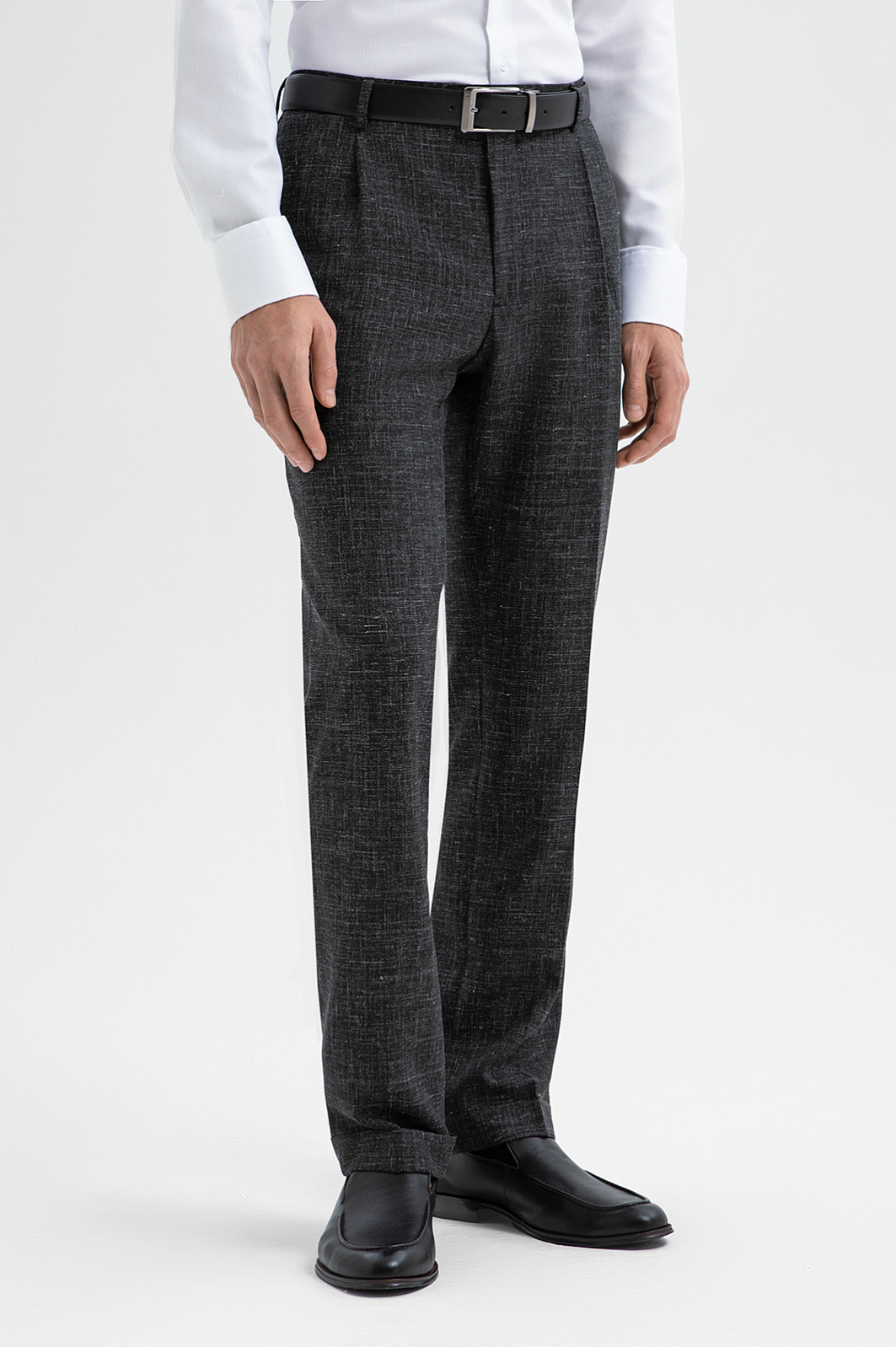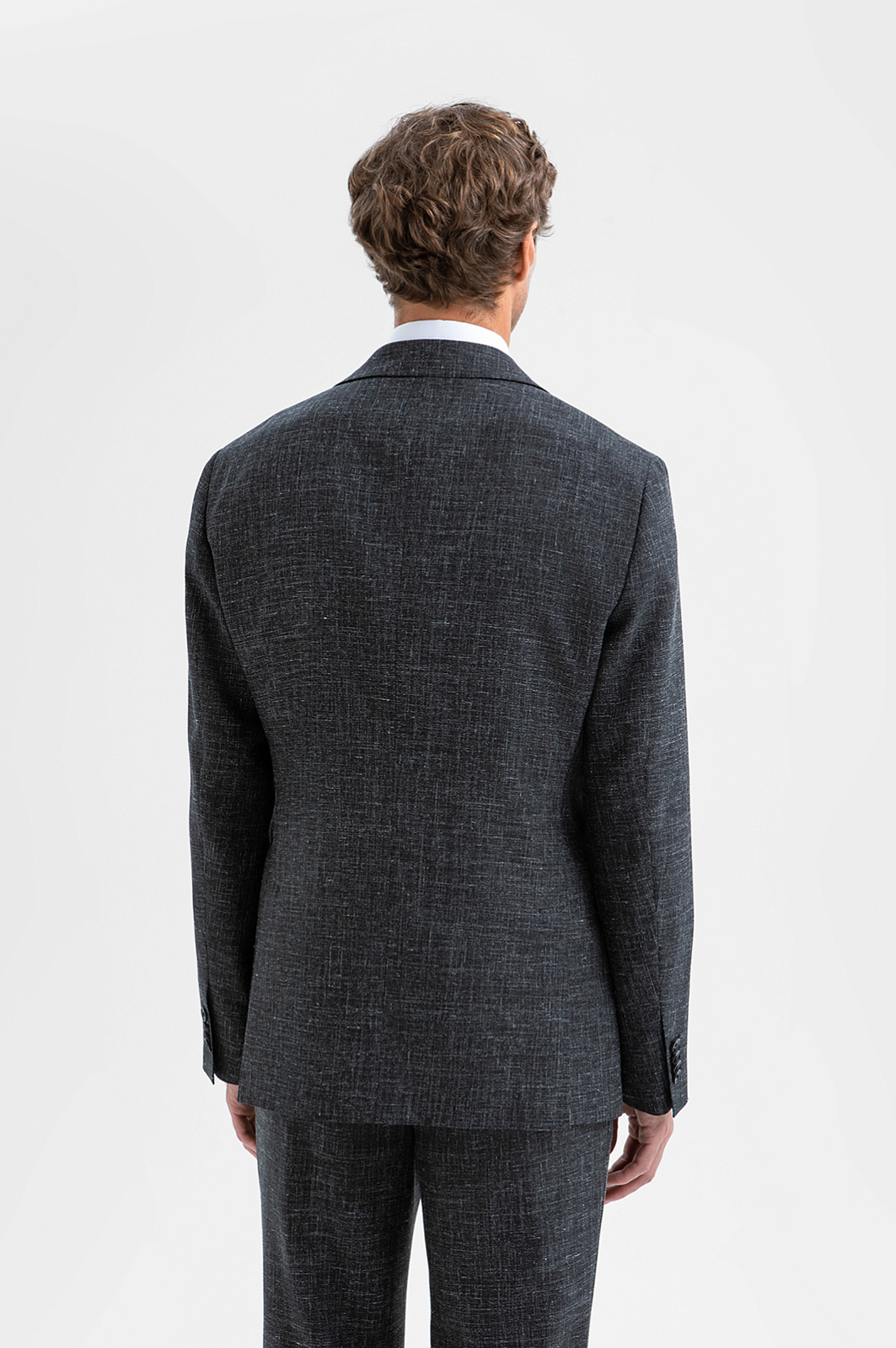 Роскошный чёрный костюм KANZLER из шерсти, льна и шёлка — интерпретация классики, которая является источником вдохновения и отправной точкой для создания современных деловых образов. Главное отличие модели — жилет, который превращает союз брюк с пиджаком в костюм-тройку. Многослойное сочетание сохраняет изящество благодаря слегка зауженному крою всех элементов и облегчённой конструкции пиджака. Меланжевый эффект смягчает категоричность чёрного и делает образ менее формальным. Дорогая натуральная ткань создана из шерсти мериноса с добавлением льна и шёлка. Тонкое волокно мериноса поддерживает форму и бережёт естественное тепло тела. Лён придает полотну структурность, шёлк — нежность и благородный лоск.