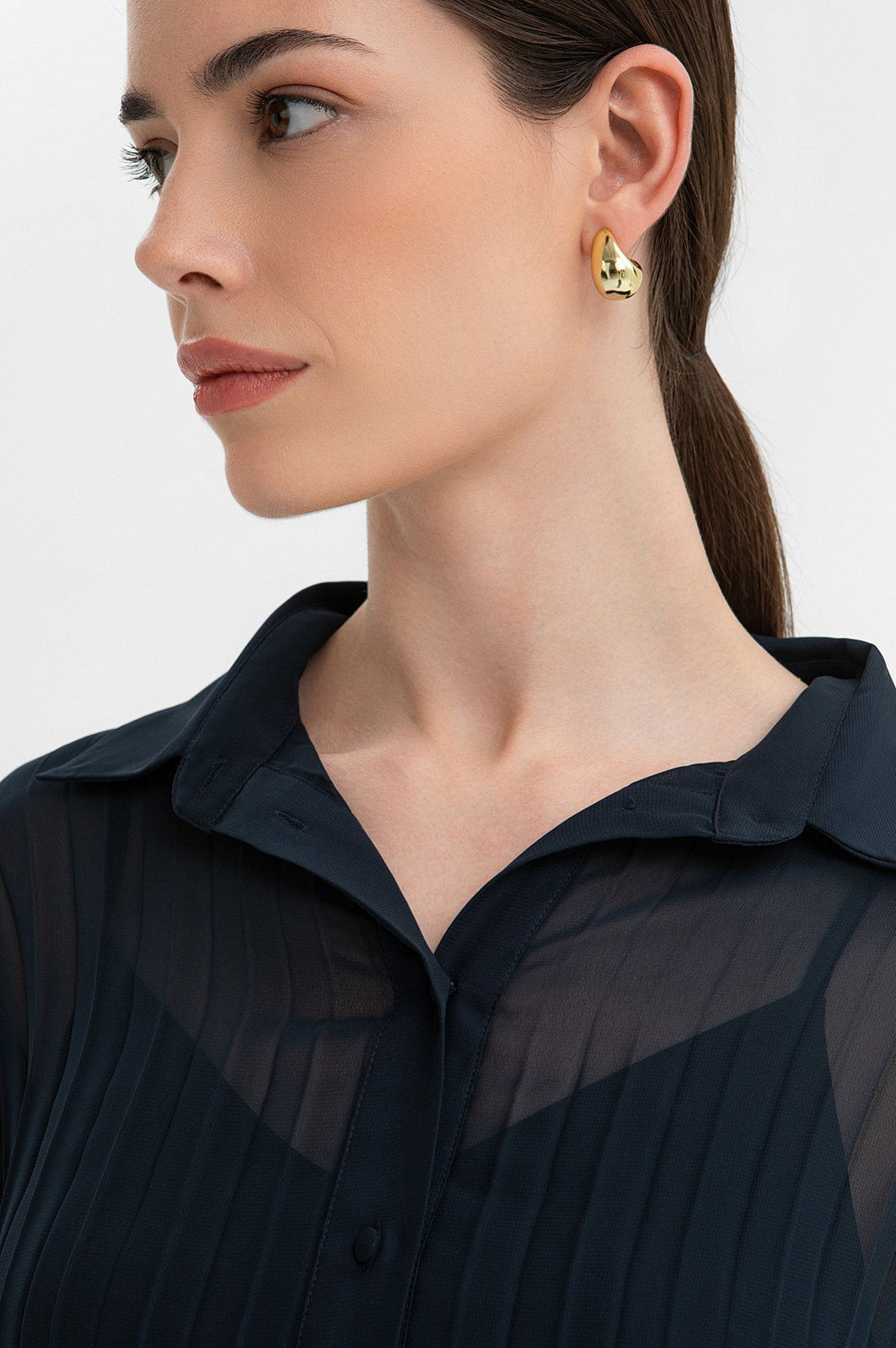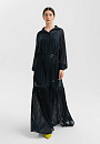 Длинное женственное тёмно-синее платье KANZLER выполнено из полупрозрачной ткани, которая красиво движется при ходьбе. Его утонченная элегантность и шик требуют особого повода — свидания или выхода в свет по случаю торжества, ужина в ресторане или театральной премьеры. Внешняя ткань создаёт эффект многослойности и романтичного флёра. Разные виды плиссировки — крупные складки в верхней части и изящные мелкие снизу — создают увлекательную игру фактур. Отложной воротник, спущенное плечо, аккуратная планка с пуговицами и изящные манжеты на рукавах придают модели завершенность и утончённость. Регулируемый пояс-косичка с золотистой фурнитурой подчеркивает линию талии. Короткое внутреннее платье обеспечивает комфорт и необходимую непрозрачность. Материал верха создан из лёгкого прочного полиэстера. Нижний слой — из полиэстера с добавлением эластана.