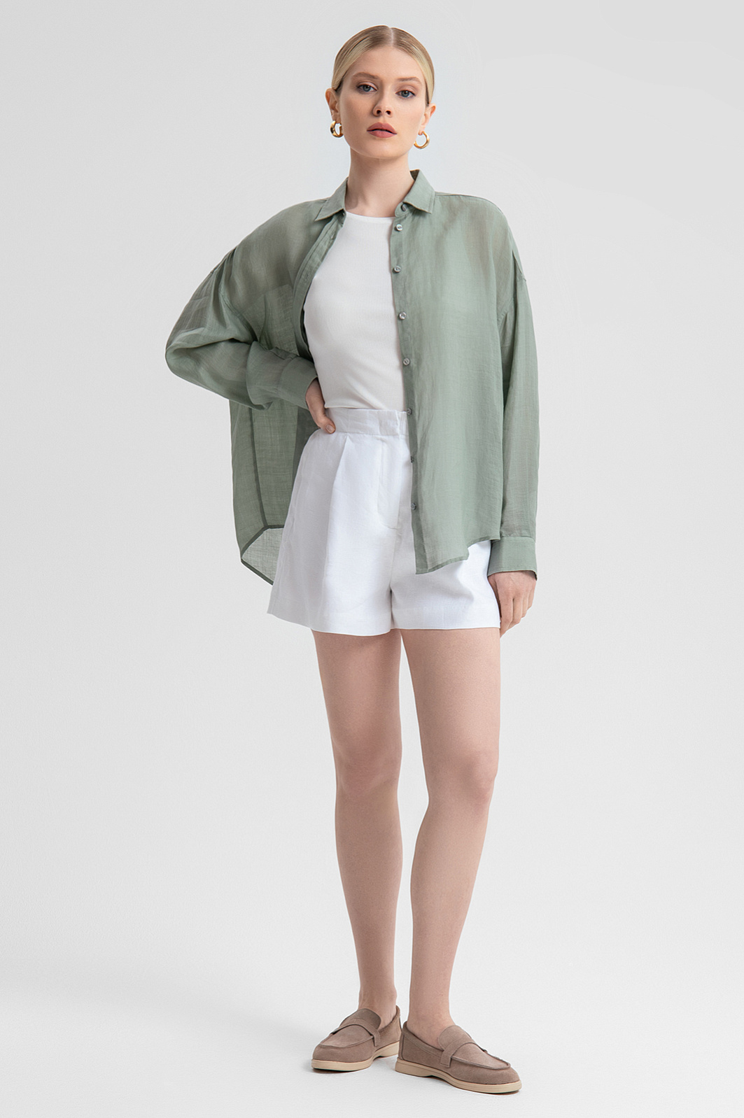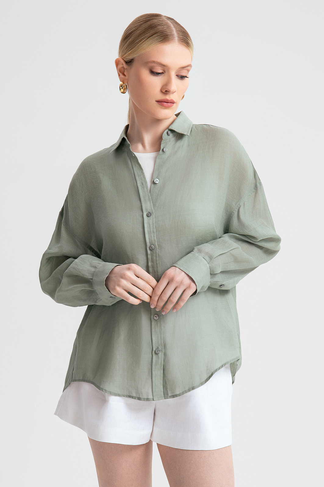 Свободная рубашка KANZLER в оливковом оттенке создана из экологически чистой ткани рами, известной своей прочностью, легкостью, приятной фактурой и легким серебристым сиянием. Натуральный, гипоаллергенный и воздухопроницаемый материал хорошо впитывает влагу и позволяет чувствовать себя комфортно в течение всего дня. Свободный крой изделия придает нотку непринужденности и не стесняет движений. Спокойный оттенок делает рубашку идеальным дополнением к базовому гардеробу, а минималистичный дизайн позволяет легко сочетать модель с различными элементами вашего гардероба, будь то шорты, юбки или брюки. Модель подчеркнет индивидуальность и станет отправной точкой для создания повседневных утонченных образов. Параметры модели: рост 175, 88-65-92 Размер на модели: S