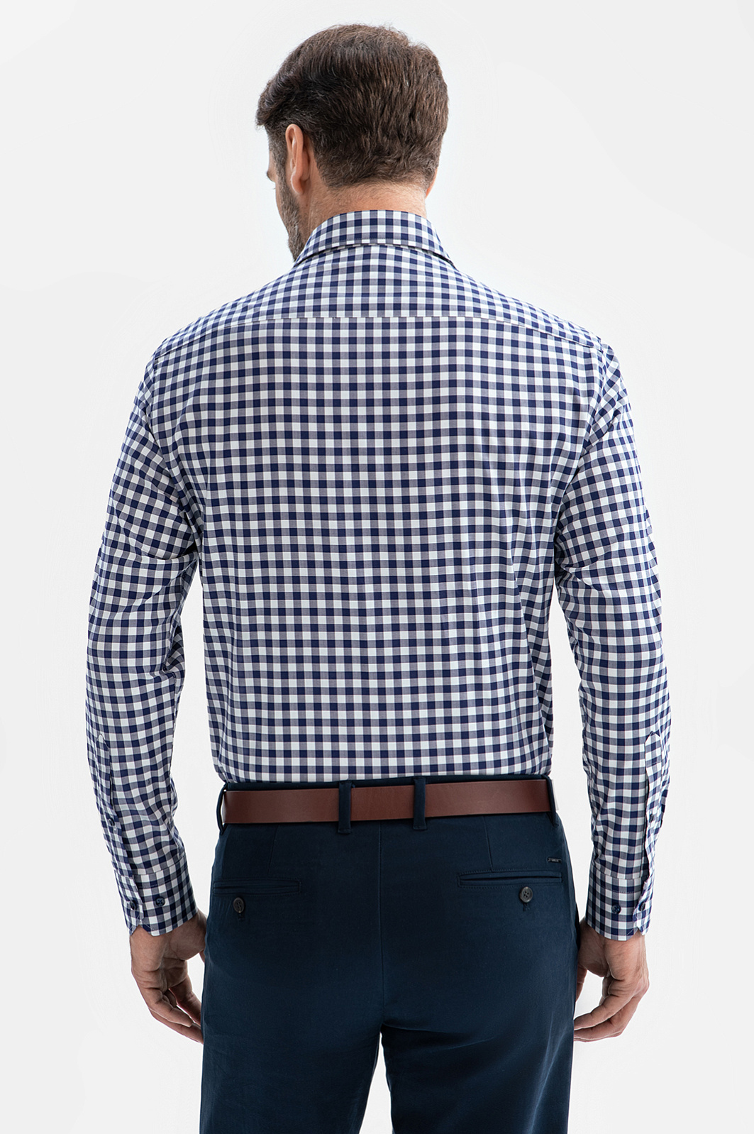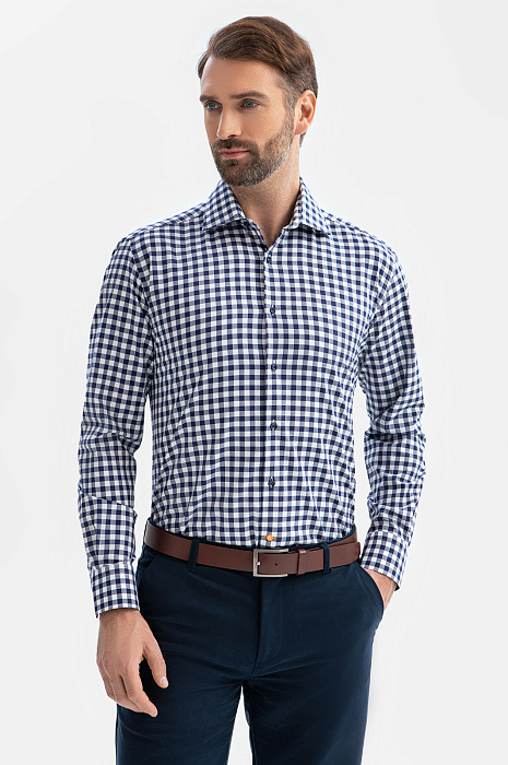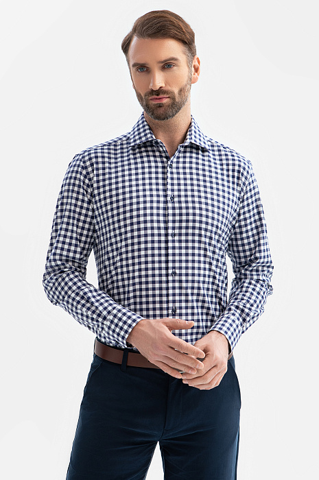 Сорочка KANZLER из чистого хлопка в синюю клетку украсит повседневный образ. Клетка — один из вечных трендов. Универсальная модель слегка прилегающего кроя сочетается со строгими и неформальными брюками и джинсами. Воротник с неострыми углами отворотов позволяет повязывать галстук широким узлом. Мягкая натуральная ткань из гипоаллергенных волокон хлопка обладает ценными свойствами — «дышит», долго сохраняет свежесть и поддерживает оптимальную для тела температуру. Параметры модели: рост 189, 102-80-99 Размер на модели: 40