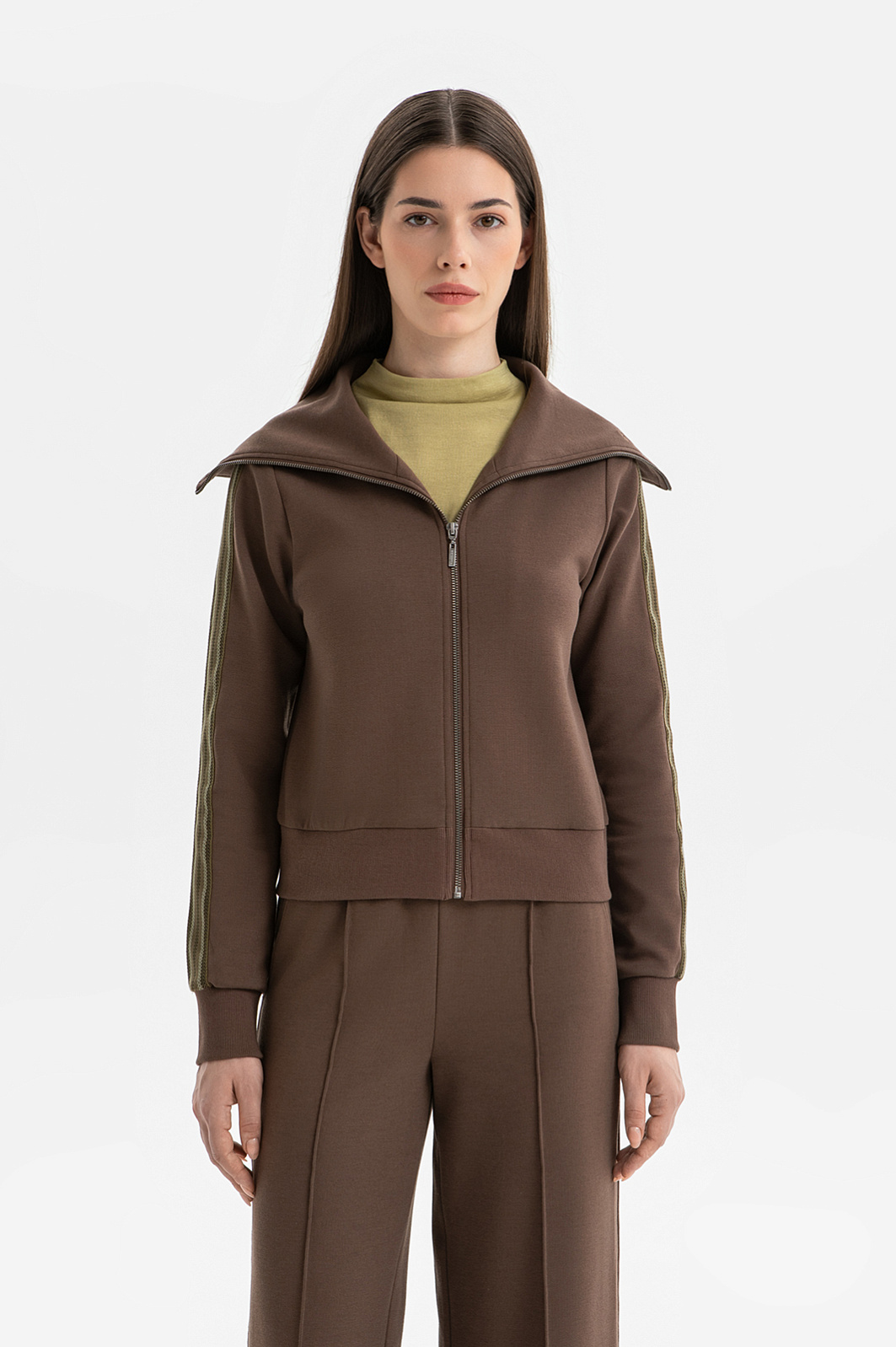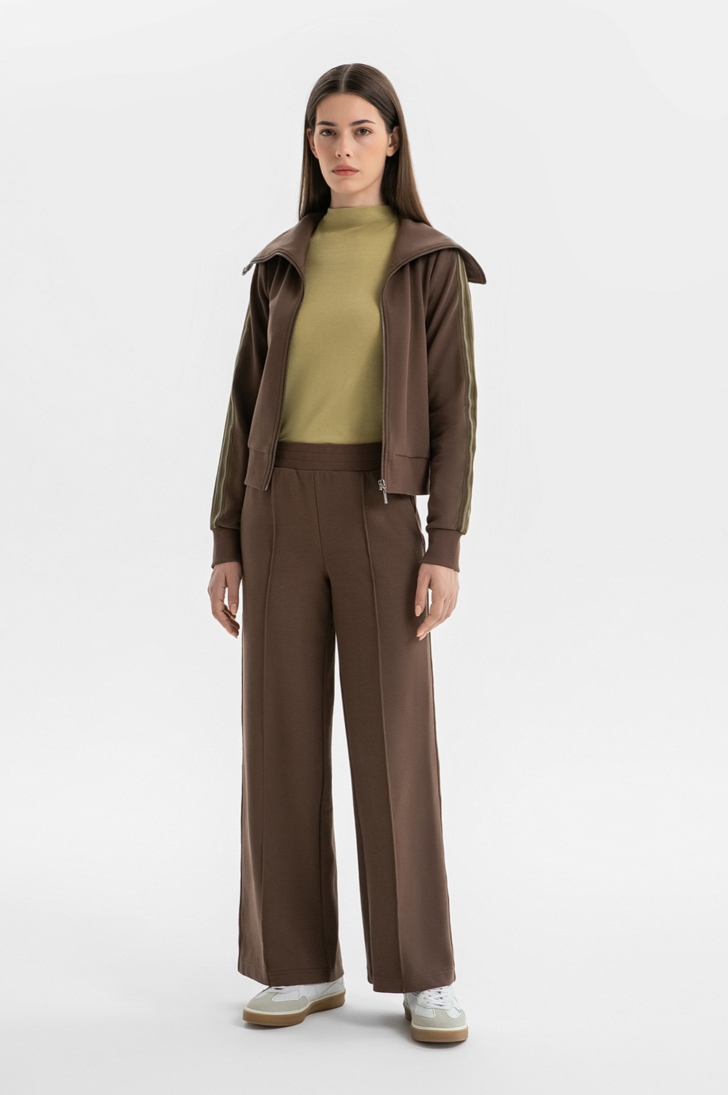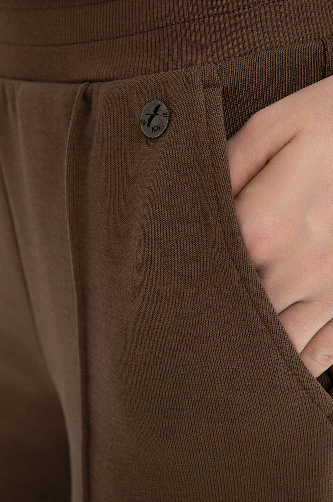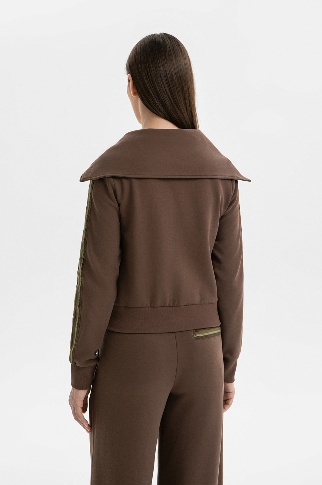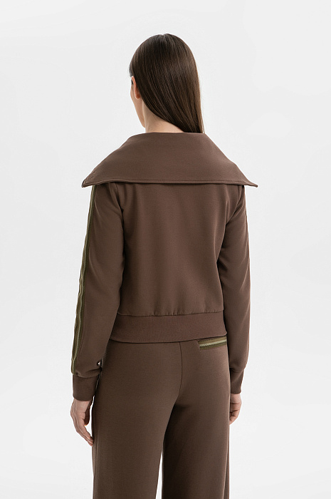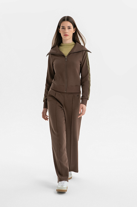 Костюм KANZLER оттенка молочного шоколада создан для времени, которое можно посвятить себе и отправиться в неспешную прогулку или приятное путешествие. Комплект составлен из толстовки с большим трапециевидным отложным воротником с изящной фирменной вышивкой в тон и удобных брюк с застроченными стрелками А-образного силуэта. Декоративным элементом служит полоска с лаконичным орнаментом в оливковых тонах, которая добавляет комплекту спортивной динамики. Костюм создан из мягкого трикотажа, в основе которого — прочный износоустойчивый полиэстер и натуральный гипоаллергенный дышащий хлопок. Небольшая добавка спандекса служит для эластичности и аккуратной посадки.